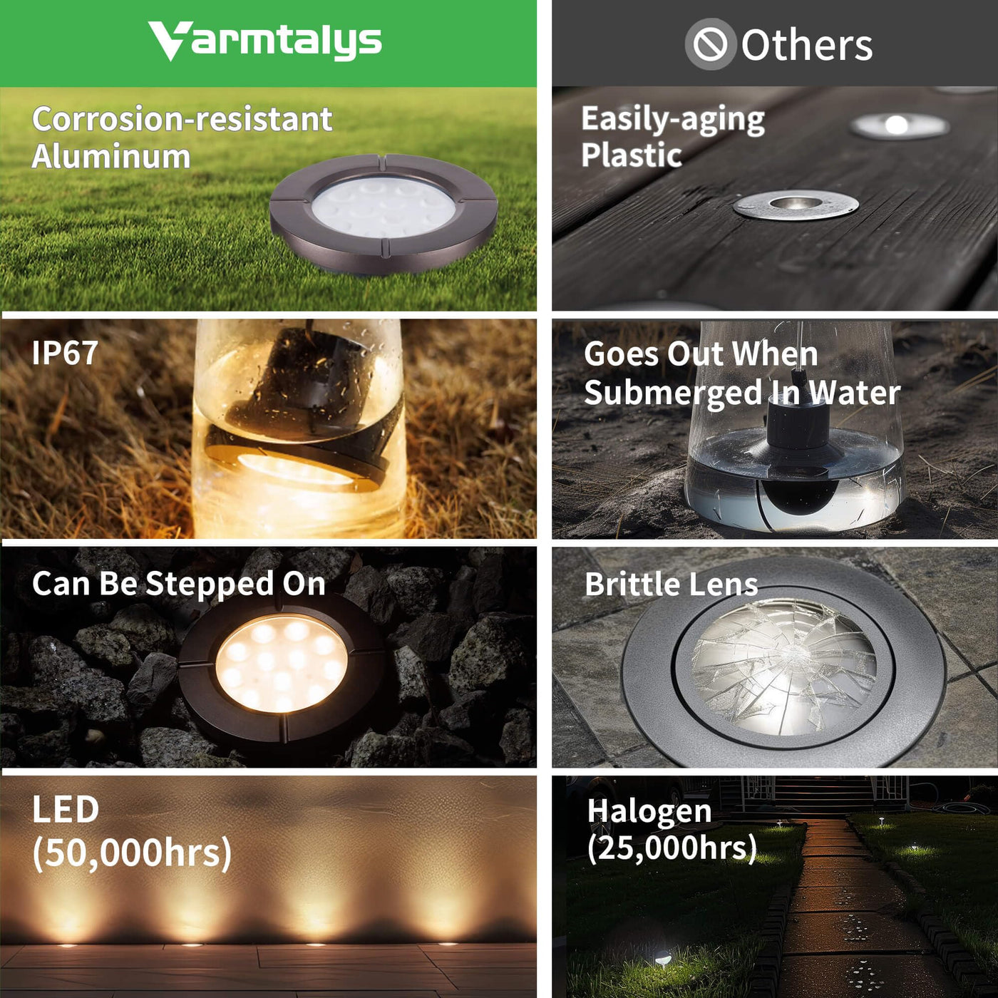 - Q: What are the main features of the Varmtalys Ground Well Lights Kit? A: The Varmtalys Ground Well Lights Kit includes 12 waterproof LED lights, a 200W transformer, a 250FT cable, and 40 wire connectors. It is designed for durability with IP67 waterproof rating and made from heavy-duty solid aluminum, ensuring it can withstand various weather conditions.