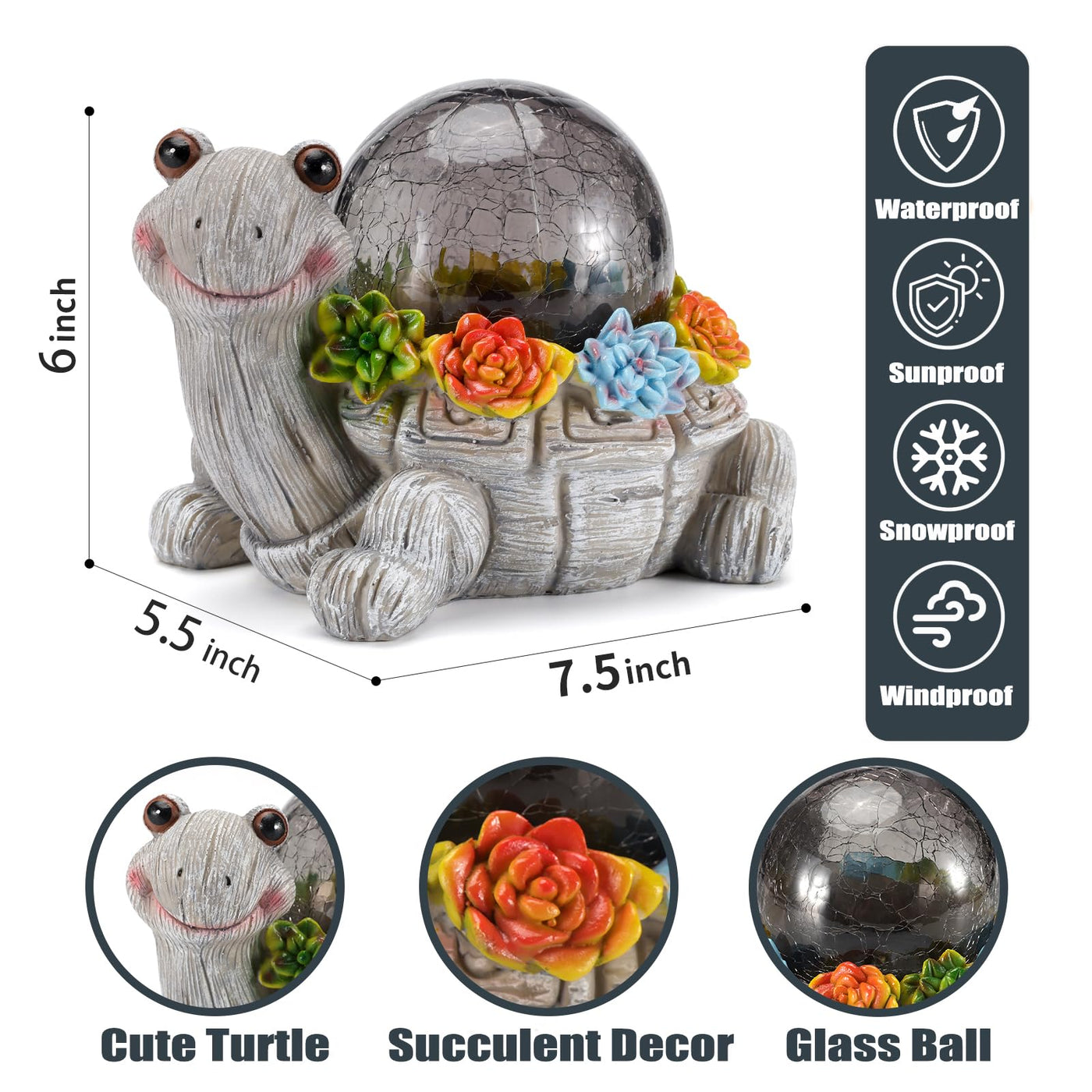 Q: What are the dimensions of the Vasesun Solar Turtle Garden Statue?A: The turtle garden statue measures approximately 5.5 inches in length, 7.5 inches in width, and 6 inches in height, making it a perfect size for various outdoor and indoor spaces.