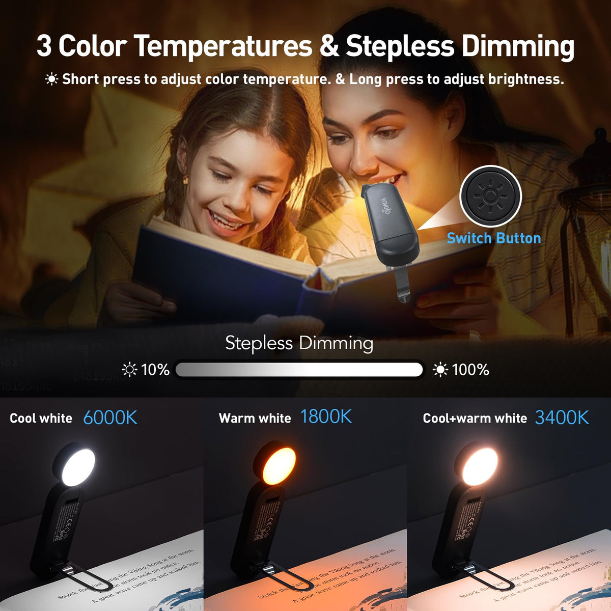 Q: Can I adjust the brightness and color temperature?A: Yes, the VAVOFO book light offers 9 different brightness modes, featuring 3 color temperatures: amber light (1400-1800K), amber light with cool white (2200-3400K), and cool white (6000-7000K). You can easily adjust the brightness and color temperature using the buttons on the device.