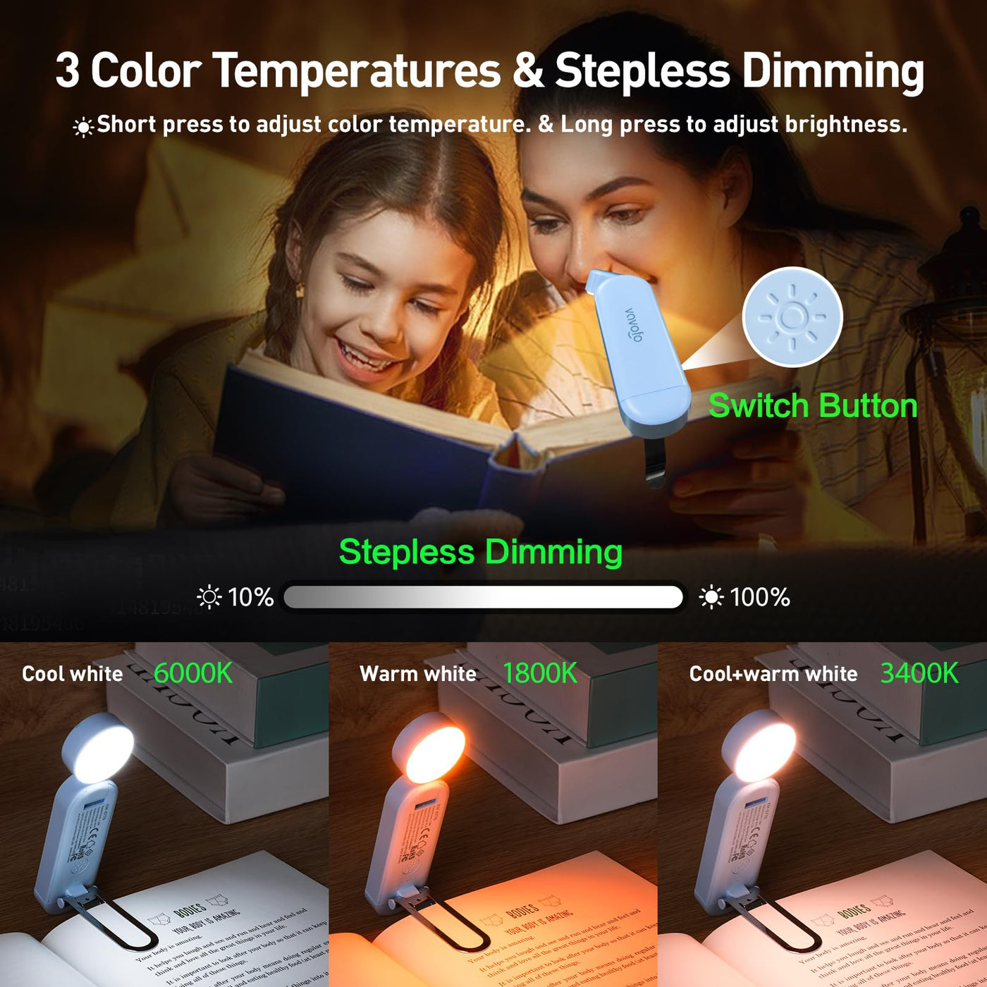 Q: What are the different lighting modes available for the VAVOFO USB Rechargeable Book Light?A: The VAVOFO USB Rechargeable Book Light features 9 different lighting modes, which include 3 color temperatures (amber light, amber light + cool white, and cool white) and 3 brightness settings (low, medium, and high). This allows you to customize your reading experience based on your needs.
