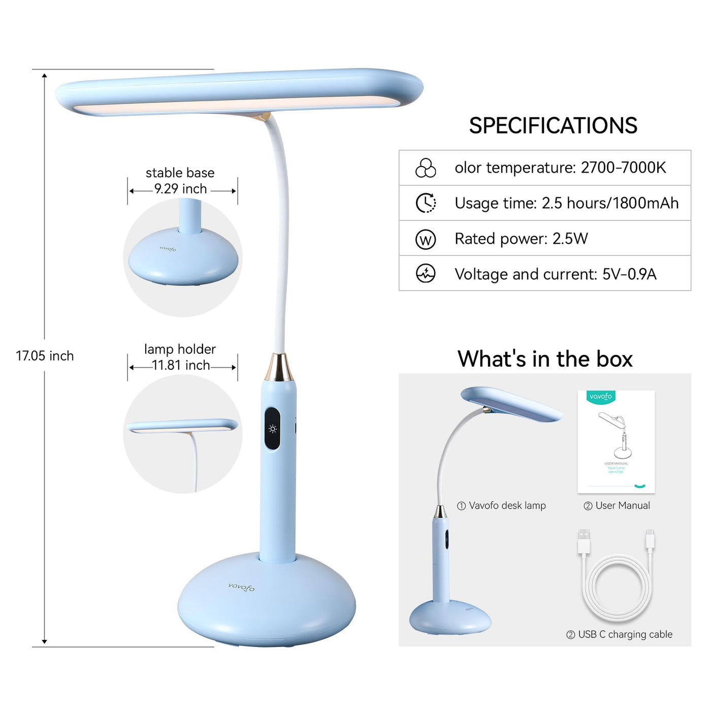 Q: What are the adjustable color temperature settings of the VAVOFO Wireless LED Desk Lamp?A: The VAVOFO Wireless LED Desk Lamp features an adjustable color temperature range from 2700K to 7000K, allowing you to customize your lighting from warm to cool tones, making it suitable for various activities like reading, working, or relaxing.