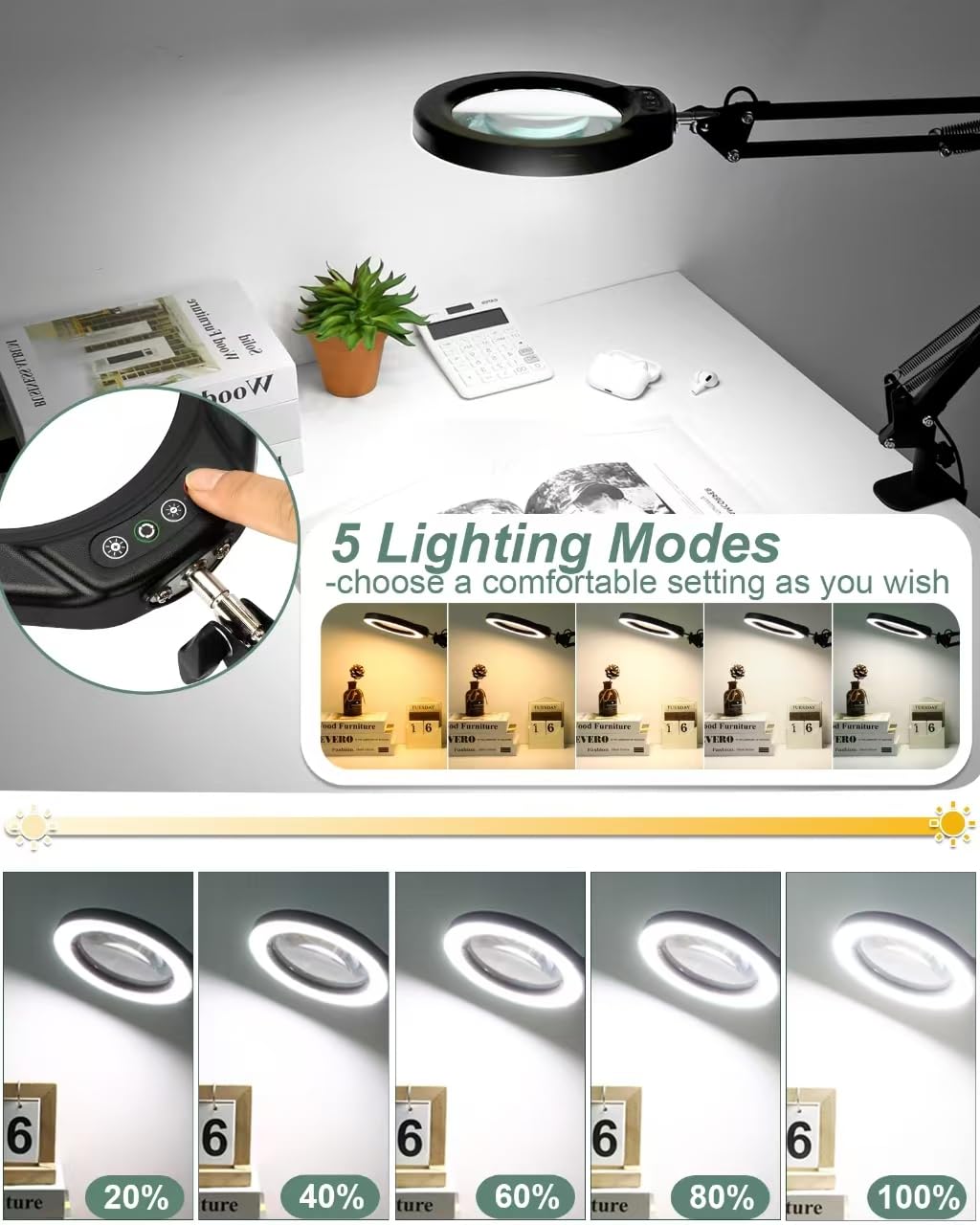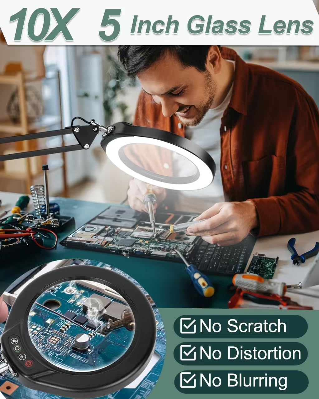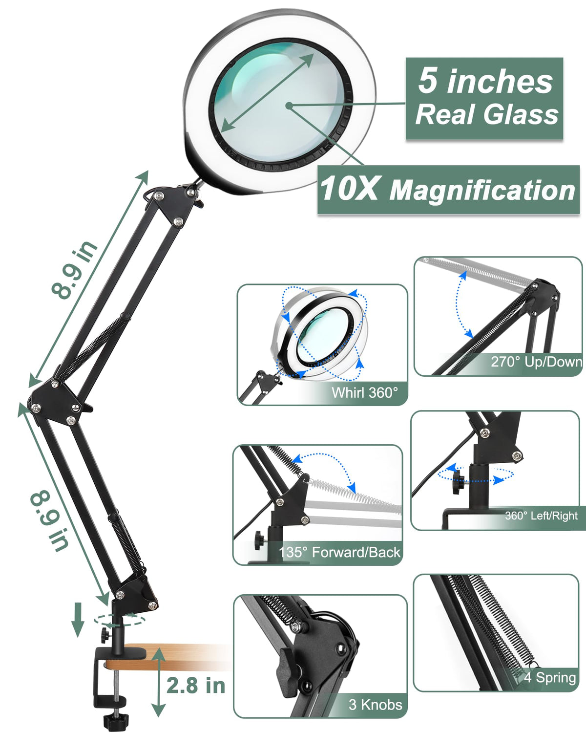 Family Gift: Perfect For Birthday Gifts, Mother Day'S Gifts, Thanksgiving Gifts, Christmas Gifts, New Year, And All Holiday Gifts. Also Good Idea For Grandmothers, Grandfathers, Moms, Dads, Wives, Husbands, Old Friends And More. Large 5 Inch Lens: The Lens Of Our Magnifier Is 5 Inches, Which Has A Larger Lens Than The Ordinary Lens On The Market, And The Larger Lens Provides A Wider Magnification Field Of View And A Better Product Experience. Convenient Light Head Switch: The Control Switch Button For Our Magnifiers Is On The Head Of The Lamp, And The Control Switch Is Within Easy Reach, Making It Easy To Adjust The Light Without Having To Stop What You'Re Doing. High-Quality Magnifier: Real Glass Lens Provides 10X Magnification To See Small Details Easily. 5 Color Modes & Stepless Dimmable: Providing Ideal Light Levels For Painting, Sewing, Jewelry Making, Diy, Painting,Task, Crafting, Puzzles, Cross-Stitch, And Knitting By Different Lighting Modes And Brightness Options. Eye Protection: Soft Led For Natural Color And Shadow-Free Magnification. The Magnifying Lamp Won'T Make Eyes Fatigued Staying In The Light For A Long Time. Product Information: Color: Black Glass Magnifier: 5 Inch Light Source: Led Daylight Lamp Color Temperature: 5 Color Modes Material: Alloy And Glass Each Arm Length: 2*8.9 Inch Magnifier Power: 10X Clip Max Opening Size: 2.8 Inch Rating Voltage: 110V/60Hz Product Packaging: 1 * Led Magnifying Lamp 1 * Metal Clamp 1 * Ac 5V/2A Adapter 1 * Wipe Cloth 1 * User Manual