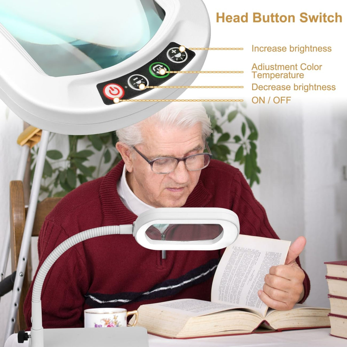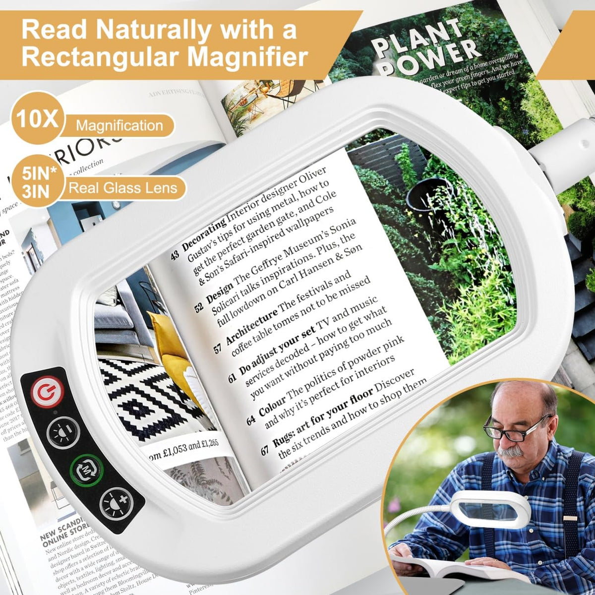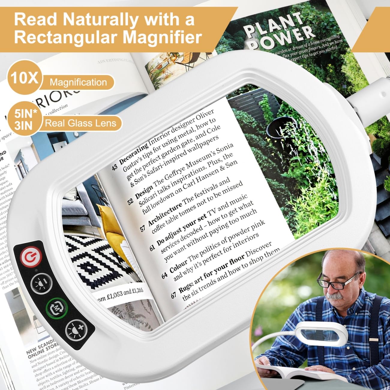 Ideal For Precision Work: Designed To Match Your Natural Reading And Crafting Habits, The Rectangular Lens Offers Wider Coverage And Is Perfect For Tasks Like Reading, Sewing And Embroidery. It Ensures You Can See Every Detail Clearly Without Straining Your Eyes. Space-Saving Design With Multi-Functional Base: The Magnifier Comes With An Upgraded Rectangular Metal Base That Provides Enhanced Stability To Ensure You Are Stable When Using The Magnifier On Your Desk. In Addition, The Base Is Sturdy Enough To Double As A Small Workbench, Making It The Perfect Companion For Various Diy Projects In Your Office Or Workplace. Hands-Free Design For Crafting: Our Magnifier With Light Is Designed To Free Up Your Hands For A Variety Of Crafting Scenarios Such As Miniature Painting And Nail Art. It Allows You To Focus On Your Work Without The Hassle Of Holding A Lamp, Ensuring Precision And Comfort For Your Creative Projects. Specification: Exterior Color: White Magnification: 10X Color Temperature: 5 Color Modes Rating Voltage: 110V-220V Light Source: Led Daylight Lamp Material: Alloy And Glass Package Includes: 1 * Led Magnifying Lamp 1 * Metal Base 1 * Ac 5V/2A Adapter 1 * Wipe Cloth 1 * User Manual