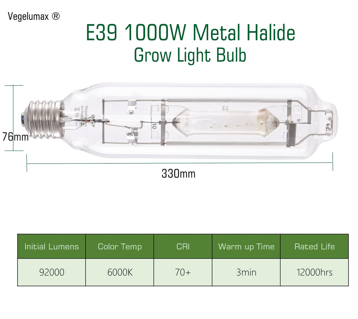 Vegelumax Mh 1000W Metal Halide Single Ended Hid Grow Light Bulb Lamp High Par Enhanced Blue And Violet Spectrums For Hydroponic Horticulture Vegetative Growth,Cct 6000K,92,000Lumens,E39 Base