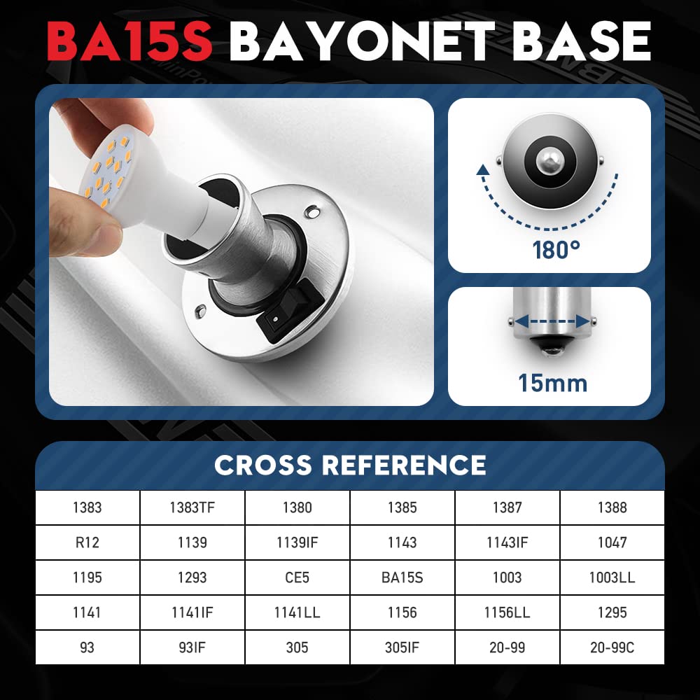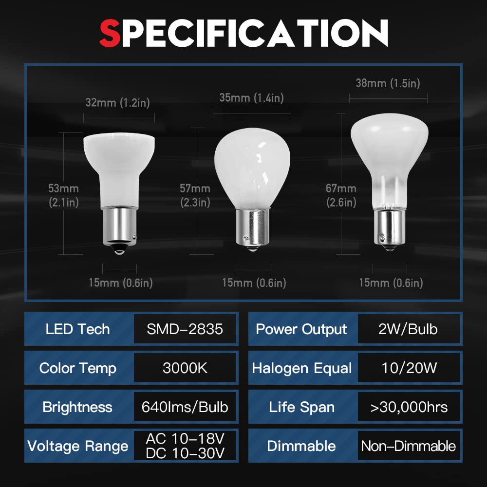 LED Chips: 12 pieces 2835-SMD Beam Angle: 180 Degree Brightness: 640lms/bulb Output Wattage: 2W/bulb Working Voltage: DC 10-30V / AC 10-18V Color Temperature: 3000K Soft Warm White Life Span: Up to 30,000 Hours. Warranty: One Year guaranteed on manufacturer quality. Fitment: BA15S R12 1383 1383TF 1384 1385 1380 1387 1388 12088 12814 12821 69 71 77 93 93IF 98 105 199 303 303X 305 307 309 311 315 795 1047 1073 1093 1139 1139IF 1247 1003 1003LL 1073 1073LL 1093 1095 1141 1141LL 1143 1143IF 1155 1156 1156LL 1159 1195 1203 1247 1250 1251 1259 1293 1295 1308 1309 1459 1580X 1591 1665 1683 1691 1940 2232 2233 2396 3497 3497LL 623 631 5627 5637 CE15 7506 7506LL 7511 7527 7533 Application: RV camper/boat marine interior light, bedside reading light, counter spotlight, cabinet puck light, desk reading light, and more.