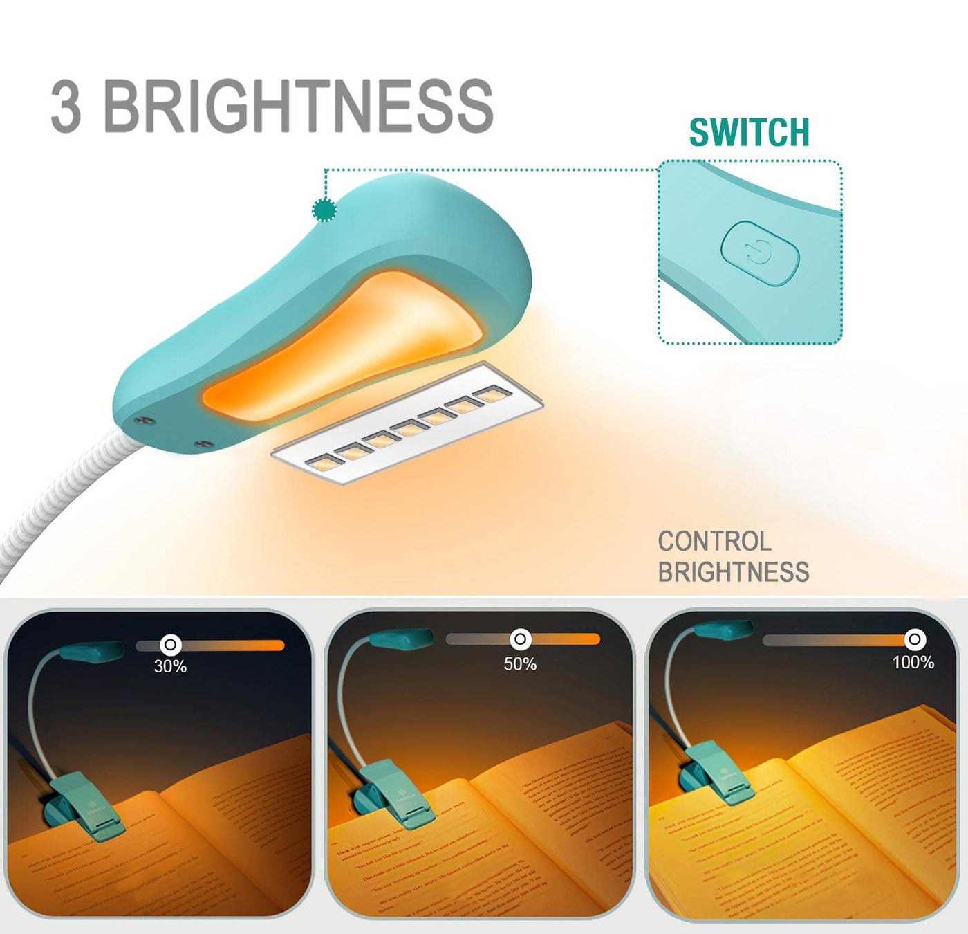 ACCOMPANY YOU TO SLEEP Our warm, amber book light, 99.95% free of blue spectrum light, can promote the production of melatonin at night, so that you can sleep better when you wake up, without getting fatigued and affecting your circadian rhythm.There are 3 different brightness levels. | LOVE TO READ AT NIGHT WITHOUT DISTURBING YOUR PARTNER? This new reading light with a 360