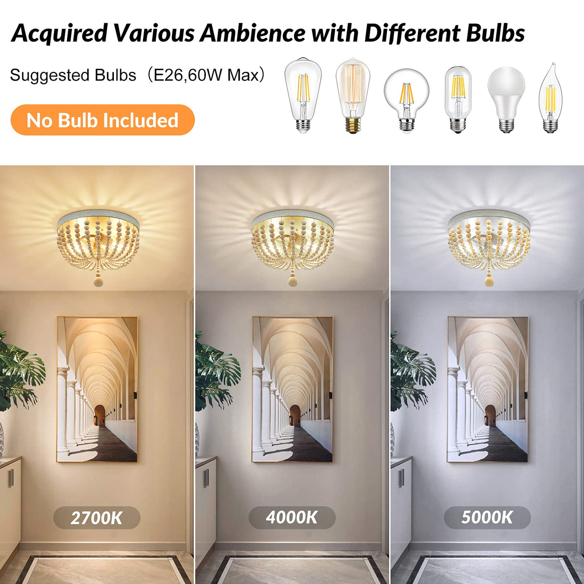 Versatile Lighting Options: Compatible with E26 base bulbs (Max 60W), this fixture supports various color temperatures, including warm white (2700k), natural white (4000k), and daylight white (5000k). Dimmable options provide customizable lighting for any occasion.