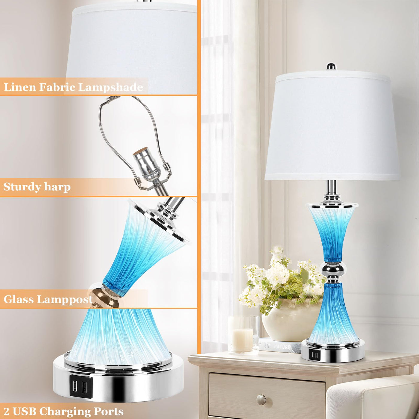 Introducing the VerRon YH-TL2380-BLUE Bedroom Lamps with USB Ports – a perfect blend of functionality and artistic design. These lamps not only illuminate your space but also serve as a stunning decor element, enhancing the ambiance of your room with their soft, cozy glow.