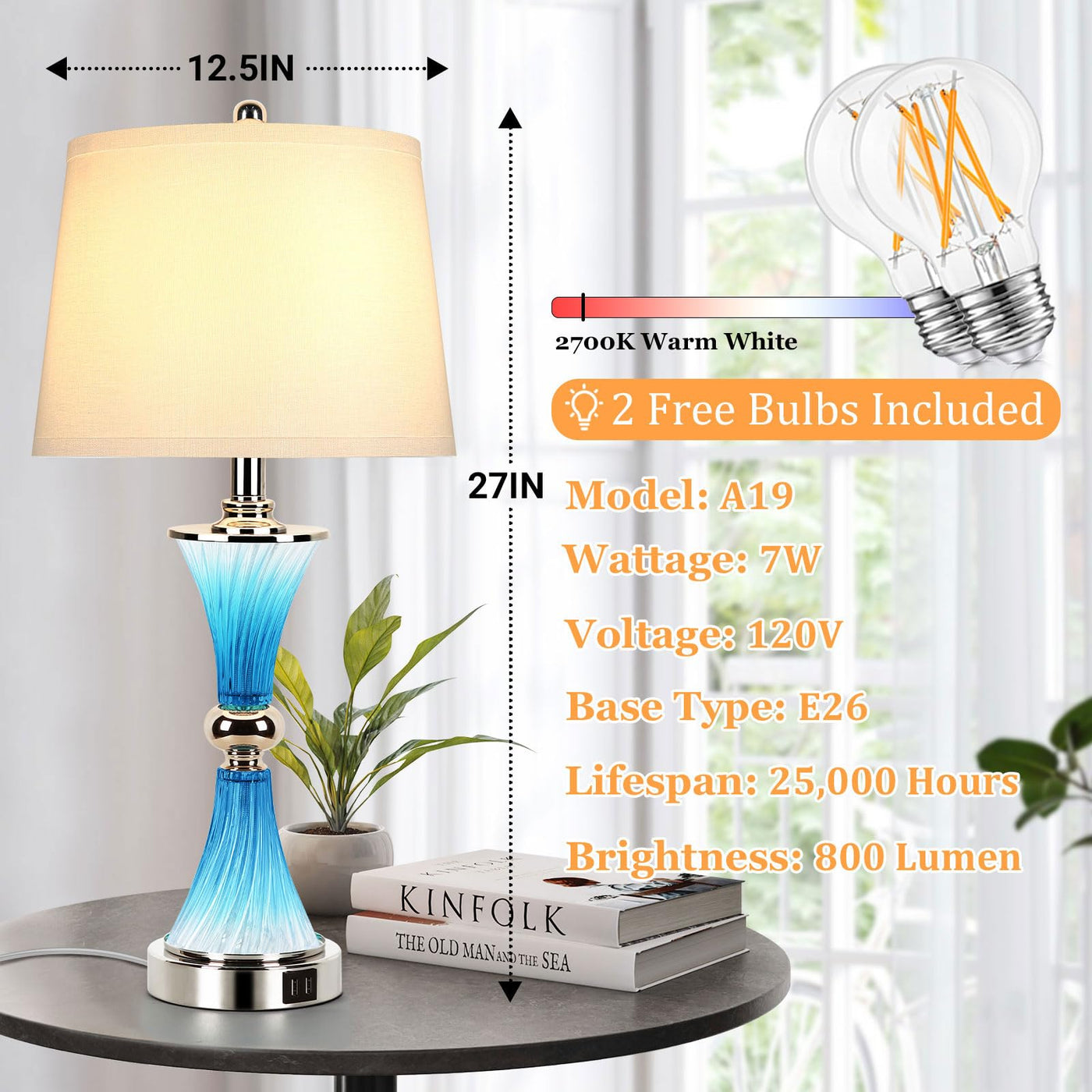 Q: What type of bulbs are included with the lamp?A: The lamp comes with 2 energy-efficient A19 LED bulbs, which provide warm white light (2700K) and have a lifespan of approximately 25,000 hours, reducing the need for frequent replacements.