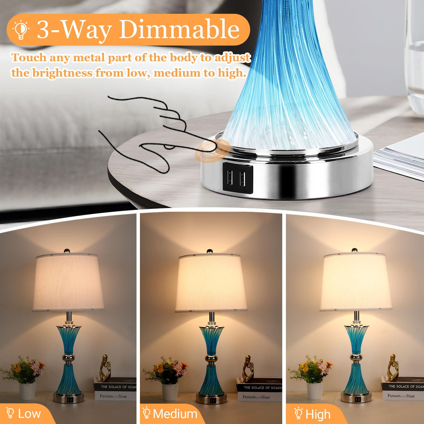 Touch Control & 3-Way Dimmable: Effortlessly adjust brightness with a simple tap on the metal part of the lamp, featuring three distinct levels to cater to your needs – low for relaxation, medium for media, and high for productivity.