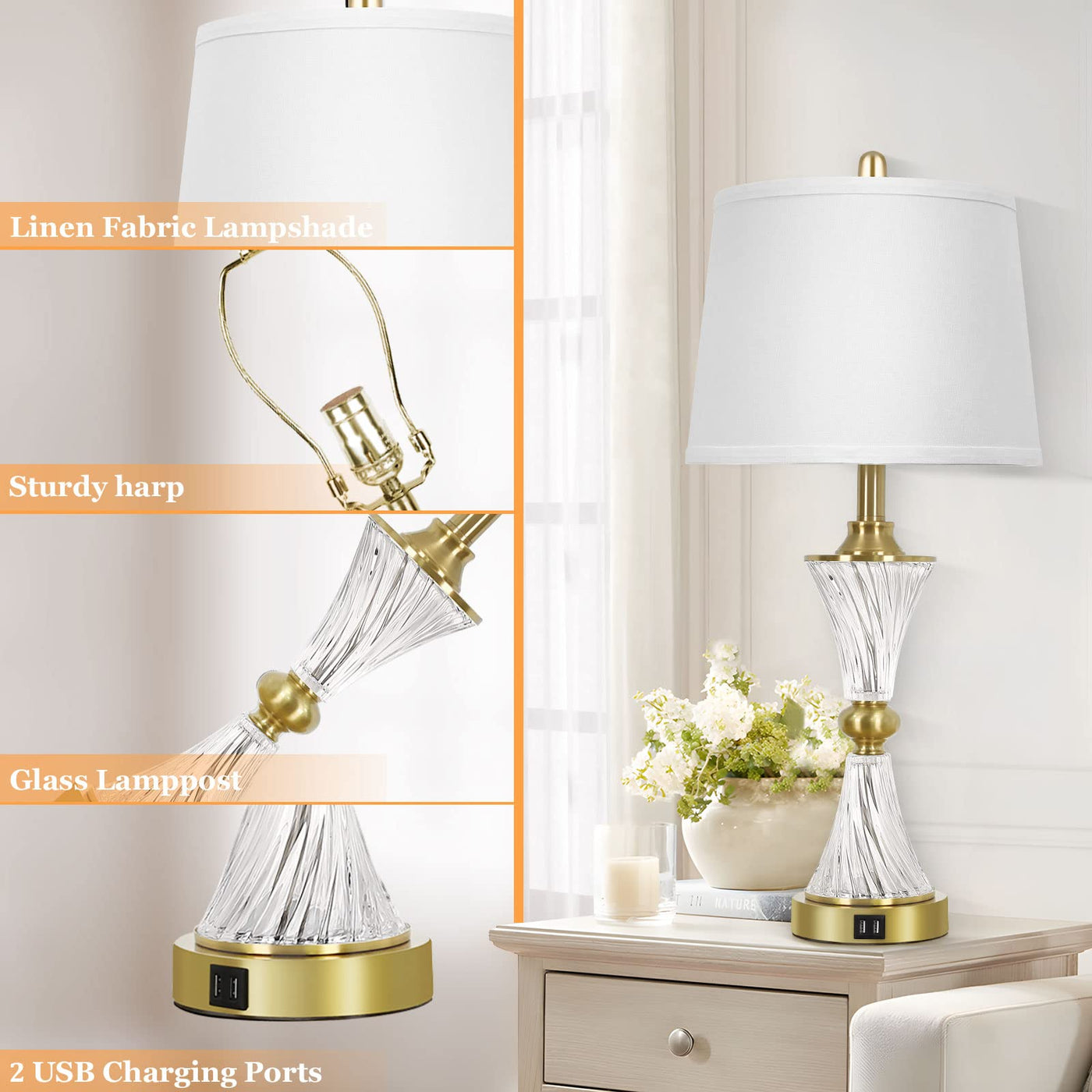 Verron Touch Control Dimmable Gold Crystal Table Lamps, Usb Ports, Set Of 2, White Shade