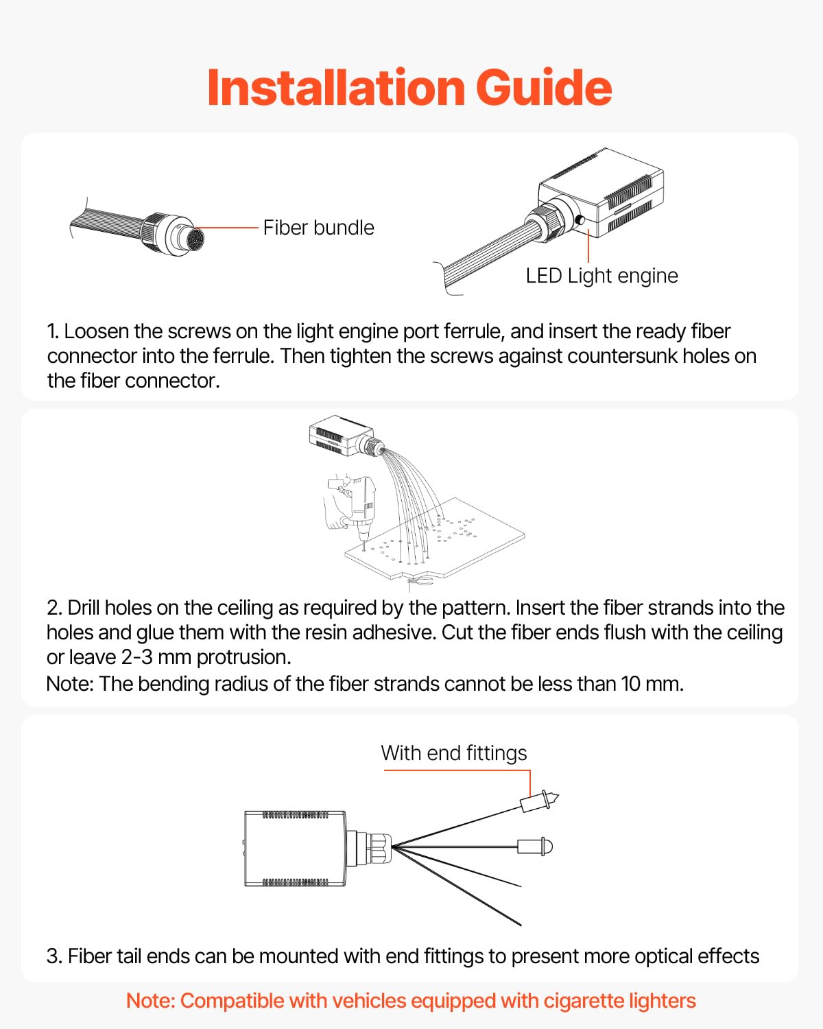 Q: What is the quality of the fiber optic cables used in the VEVOR Starlight Headliner Kit?A: The kit is crafted with premium quality fiber optic cables that provide a soft and uniform glow, enhancing brightness and creating a realistic starry effect.