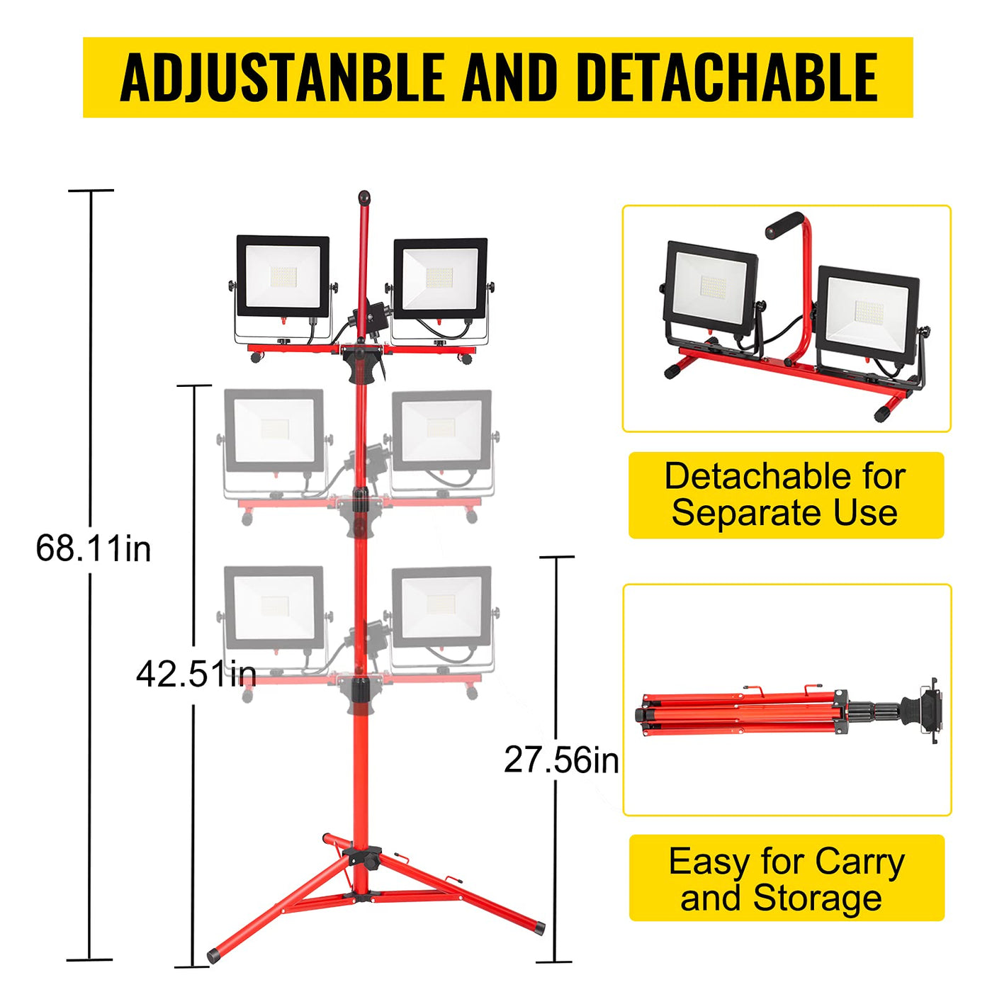 Suitable Brightness: Our 10000 lumen 5000K dual-head led work light can lit up your work place like daylight and can bring bright and comfortable environment with minimal energy consumption great Flexibility: The telescoping tripod can be easily folded for transport or storage, and can be easily adjusted to several different heights, extending from 276(minimum) to 6811(maximum), to meet your need during work The lights are detachable and can be used with the handle independently Rotatable LED Work Lights: The body of the led light can be rotated 360A horizontally and 270A vertically, which allows you easily lit up wherever you need to by only adjusting the lights but not moving the whole appliance The heat emission structure on the back of the light ensures work efficiency and its service life IP65 Waterproof Level: IP65 waterproof technology is adopted for details from housing, frames, to all the connecting parts So that the lamp can be used in humid environment and is not easy to aging or be damaged Durability and Long Lifespan: The aluminum lamp shell is resistant to corrosion and rust The toughened glass cover is anti-impact, the stand is solid and stable With these features, please rest assured to use it outdoors, even in bad weather