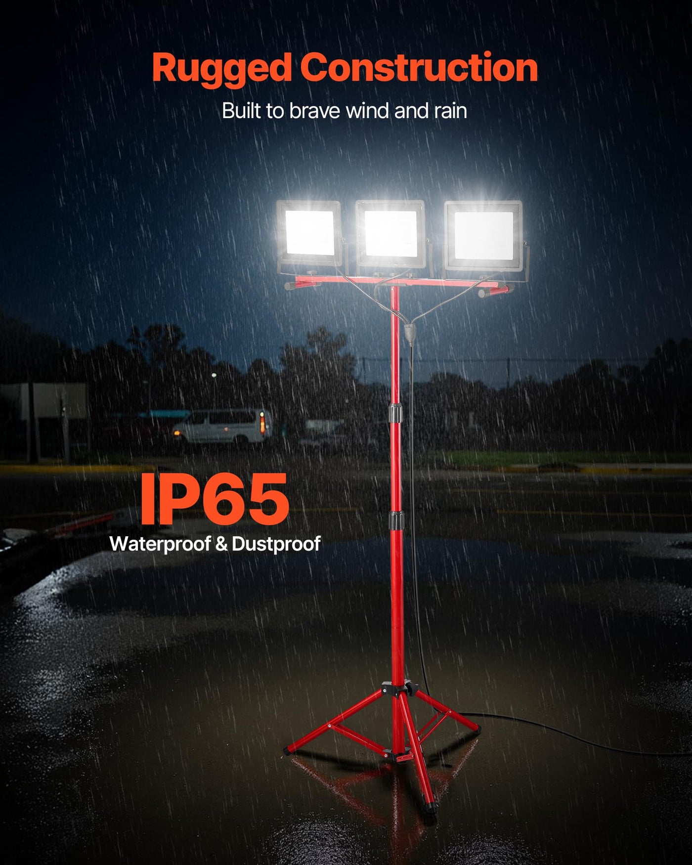 Wide Range Illumination: Our LED work light with stand supports brightness adjustment up to 21000 lumens, covering from soft light to intense light without glare and dimness. Ideal for garage repairs or garden gatherings, it delivers the lighting you need | Multi-Angle Independent Lighting: Each detachable head features individual switches and directional adjustment, which allows the portable work light to be wall-mounted or used on a desktop, providing flexible lighting in outdoor repairs or power outages | Highly Flexible & Adjustable: This LED work light features flexible height adjustment from 43.31 in to 70.87 in, easily adapting to various lighting angles and work areas. The tripod stand provides stable support and illumination on complex surfaces | Outdoor-Ready Resistance: Featuring IP65-rated protection, this camping light with stand resists water, dust, and impact. Its rugged shell effectively protects the included high-brightness LEDs, performing reliably in rain, wind, or harsh environments | One Light, Multiple Use: This construction light can easily handle tasks such as garden lighting, basement repairs, car maintenance, camping, or construction. The foldable tripod stand and adjustable lamp heads provide a combination of multiple uses