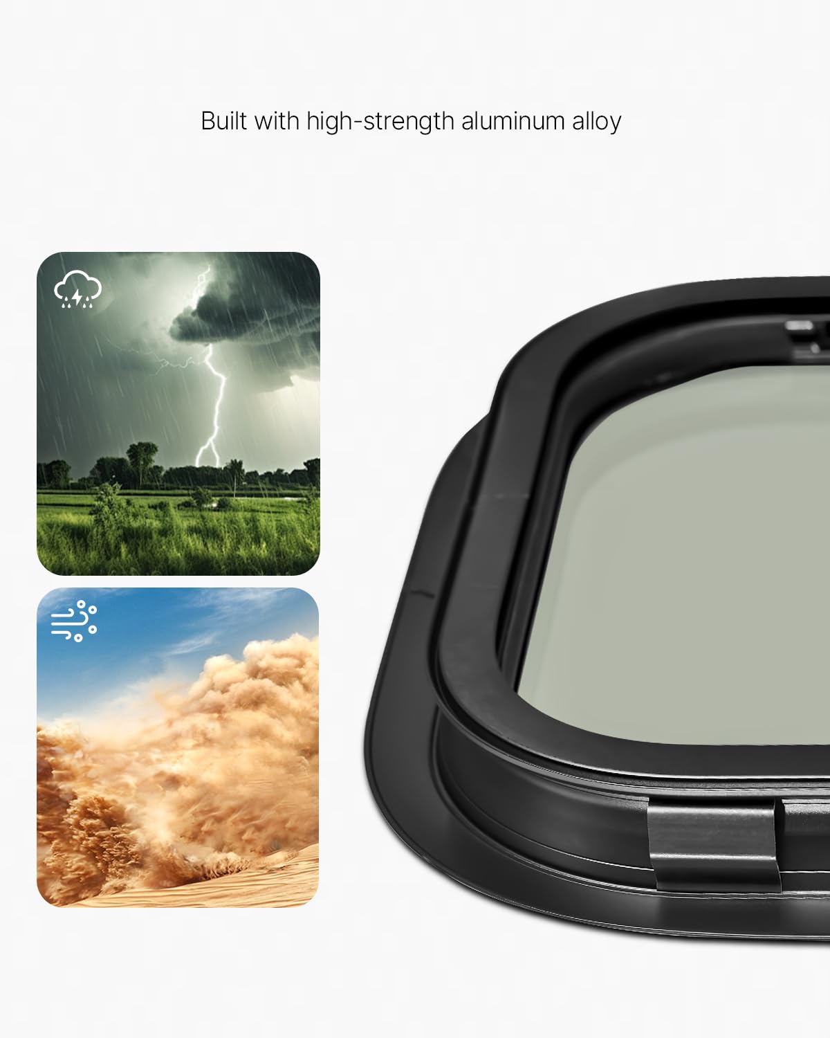 Universal Vertical Sliding Window: Our 12W x 24H vertical RV window is the ideal replacement for old or damaged windows. Designed to fit 15/16 - 1 3/4 thickness walls, this tinted sliding RV window provides a reliable solution for RVs, trailers, campers, and cargo trailers. | Enhanced Privacy & Durability: Made with 3.2mm black tempered glass, this wear-resistant RV window replacement offers outstanding durability. The tinted design not only provides enhanced privacy but also gives the window a sleek, modern look, adding security and style to your journey. | Durable Construction: Built with a high-strength aluminum alloy frame, this RV window for cargo trailers offers exceptional durability and corrosion resistance, making it perfect for outdoor use. And the included trim ring enhances structural stability and adds a sleek, stylish look. | Practical Features: Designed with a security lock for extra protection and a net screen for convenient airflow, this vertical sliding trailer window ensures both security and ventilation. The drainage holes prevent water accumulation, enhancing the seal and preventing leaks, making it a dependable choice for your trailer. | Easy to Install: Our vertical RV window ensures a precise and hassle-free installation with the included window wall template. This template allows you to easily mark the cutting lines, significantly reducing the risk of cutting errors. Save time and effort, and achieve a perfect fit for your window with no need for repeated measurements.