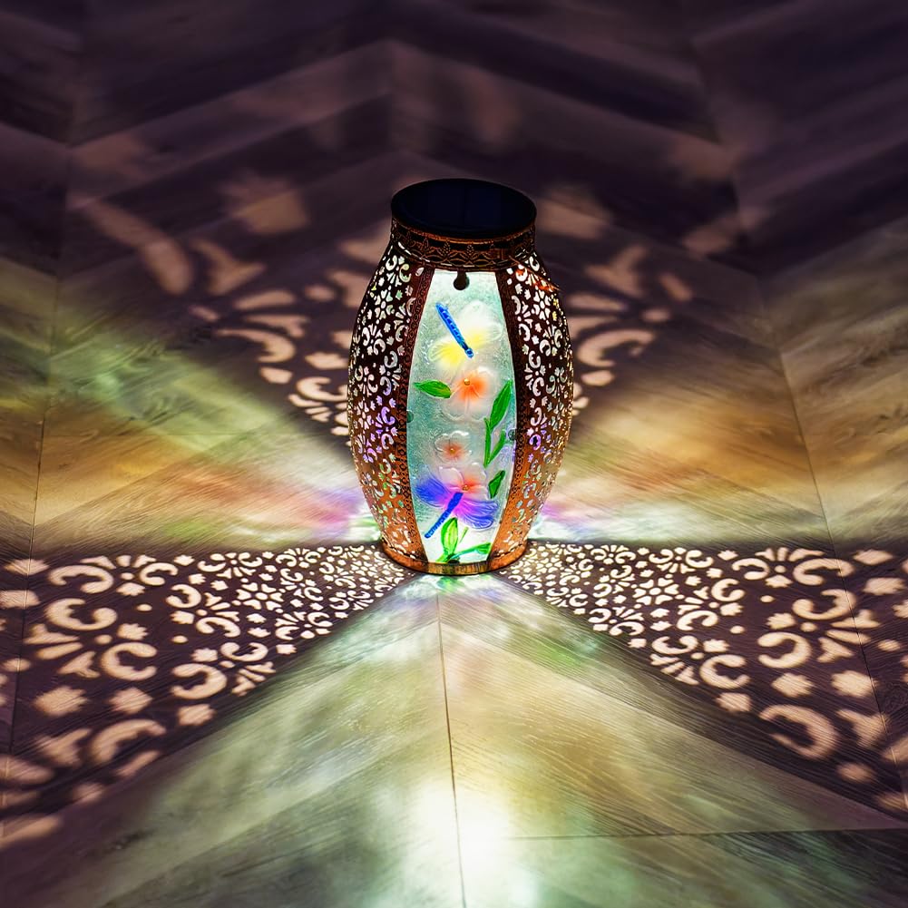 Stunning Design: This Elegant Solar Lanterns For Outside Hanging Features Complex Copper Laser Cut Patterns And Dragonfly Patterns, Complemented By Vibrant Colored Glass Panels Showcasing Blooming Flowers Of All Colors, Adding Vintage Charm To Any Space.Solar Powered: Our Outdoor Solar Lantern Are Equipped With Efficient Solar Panels And Light Sensors, Which Automatically Charge During The Day And Light Up At Night. Before The First Use, The Switch Needs To Be Turned On And Charged In Sunlight.Weather Resistance: This Hanging Solar Lanterns Is Made Of Rust Proof Copper Veneer Metal And Waterproof Sealed Solar Panels, Which Can Resist Rain, Snow, And Ultraviolet Radiation. Very Suitable For Use In Areas Such As Gardens, Paths, Courtyards, Etc.Romantic Atmosphere: Turn Your Backyard Into A Fairy Tale Like Environment With Large Solar Lanterns Outdoor Waterproof. Hollow Metal And Colored Glass Patterns Create Dancing Light And Shadow, Perfect For Date Nights, Pool Parties, Or As Wedding Or Anniversary Gifts.Our Service: We Are Committed To Providing Users With Good Products And Services. If You Have Any Questions About This Solar Hanging Lantern, Please Contact Us In A Timely Manner And We Will Give You A Satisfactory Answer.