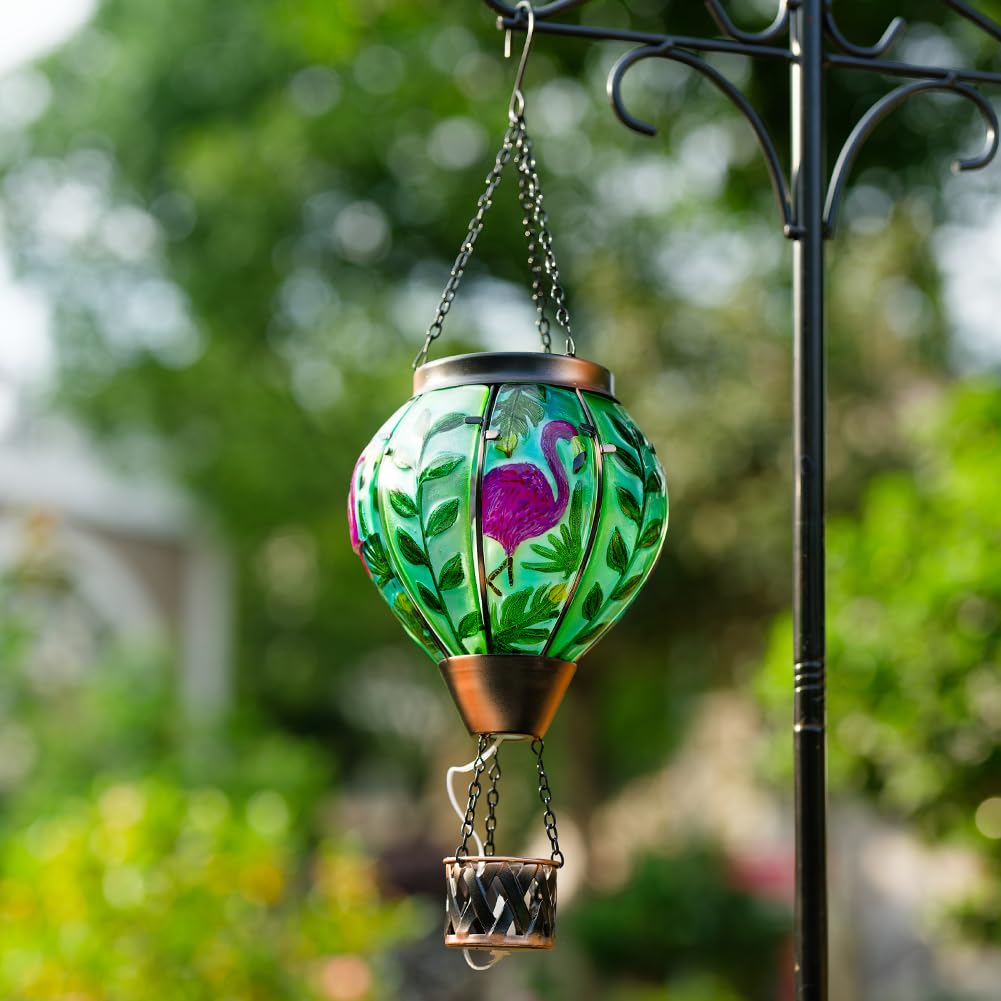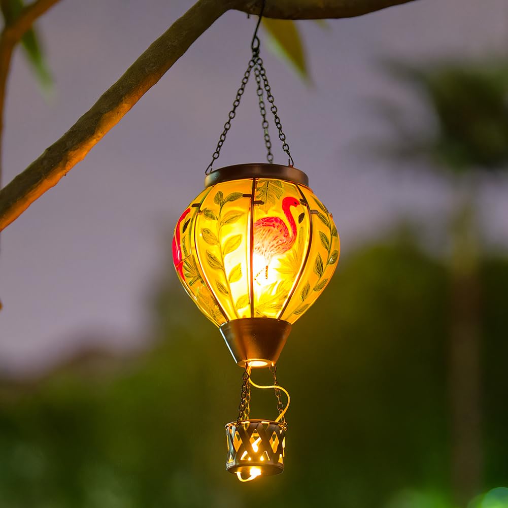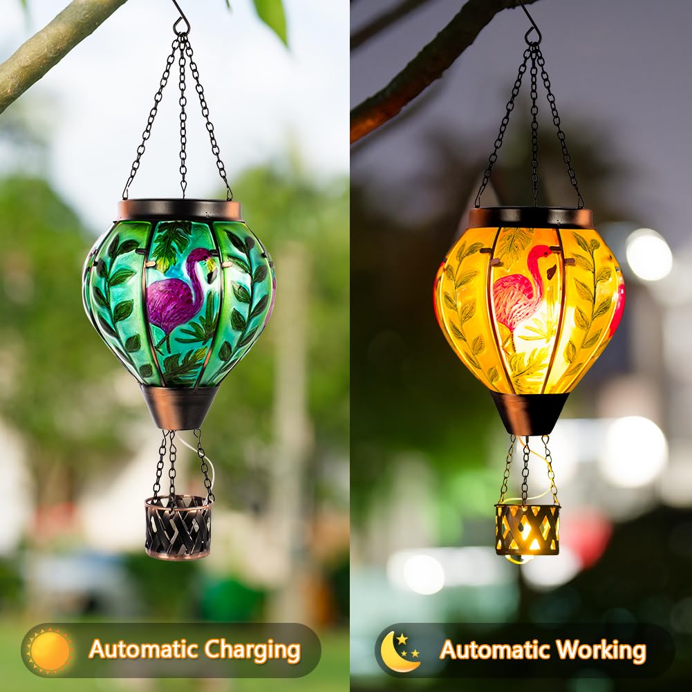 [Hot Air Balloon Solar Lantern] The outdoor lanterns are designed in the shape of a hot air balloon, with flickering flame light and metal candle holder. As night falls, the solar outdoor lanterns rise like real a hot air balloon. The design inspiration comes from the elegant and brightly colored flamingo, whose pattern is finely crafted on transparent glass, showcasing a natural beauty. [Outdoor Solar Lanterns] The outdoor solar lantern is equipped with a solar panel. There is a large capacity battery of 600mAh/1.2V. Automatic charging during the day and automatic lighting at night. After being fully charged, it can provide eight hours of illumination at night. Remember to turn on the switch before use. [Wide Application] The hanging solar lanterns outdoor waterproof serve as an exquisite gardening decoration during the day and transforms into a warm lighting tool at night. Whether outdoor lanterns for patio are for decoration or lighting, solar hanging lantern can perfectly blend into various styles of garden space. [Adjust to All Weather] The structural design of the hot air balloon lanterns take into account the needs of outdoor use, with good wind resistance and waterproof performance, ensuring the solar hot air balloon lantern's long-term stability and safety. [After-sale Service] We are well aware of your high expectations for the solar balloon lantern, and we promise to provide high-quality after-sales service to ensure that your purchasing experience is impeccable. If you have any needs, please feel free to contact us. We will do our best to provide you with the most thoughtful service.
