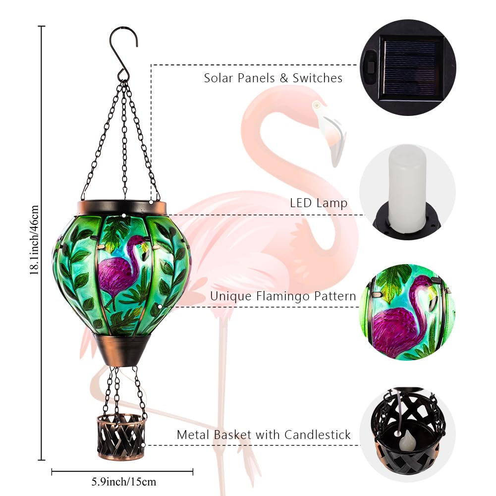 Vewolight Flamingo Hot Air Balloon Solar Lantern With Candle Holder, Hanging Solar Lantern With Flickering Flame, Glass Solar Lanterns Outdoor Waterproof For Lawn Porch Tree Decor Christmas Gifts