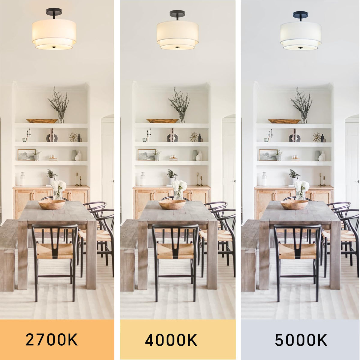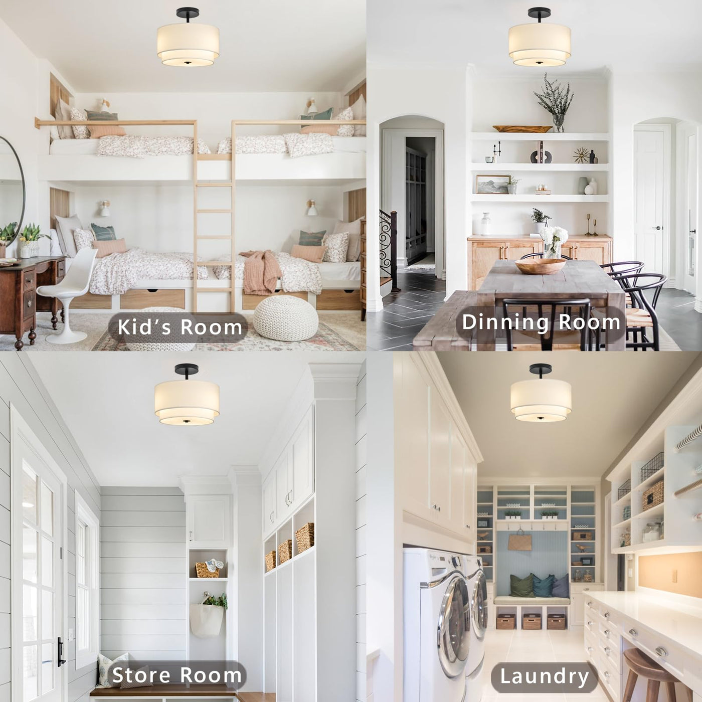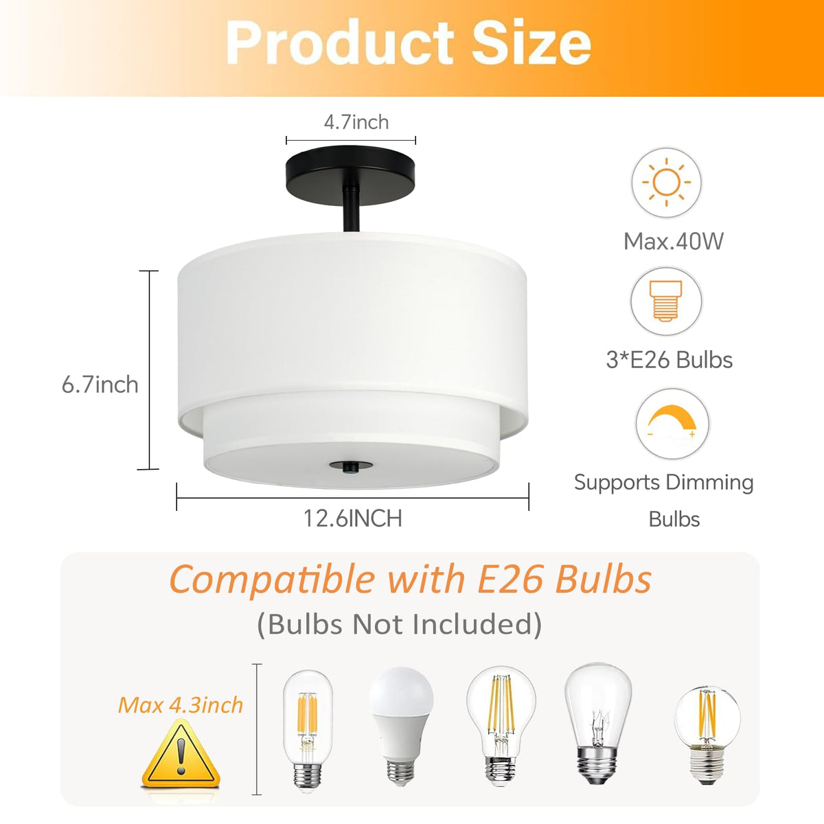 Vexagyle 3-Light Semi Flush Mount Ceiling Light Fixture,12.6Inch Modern Close To Ceiling Light With 2-Layer White Drum Fabric Sh