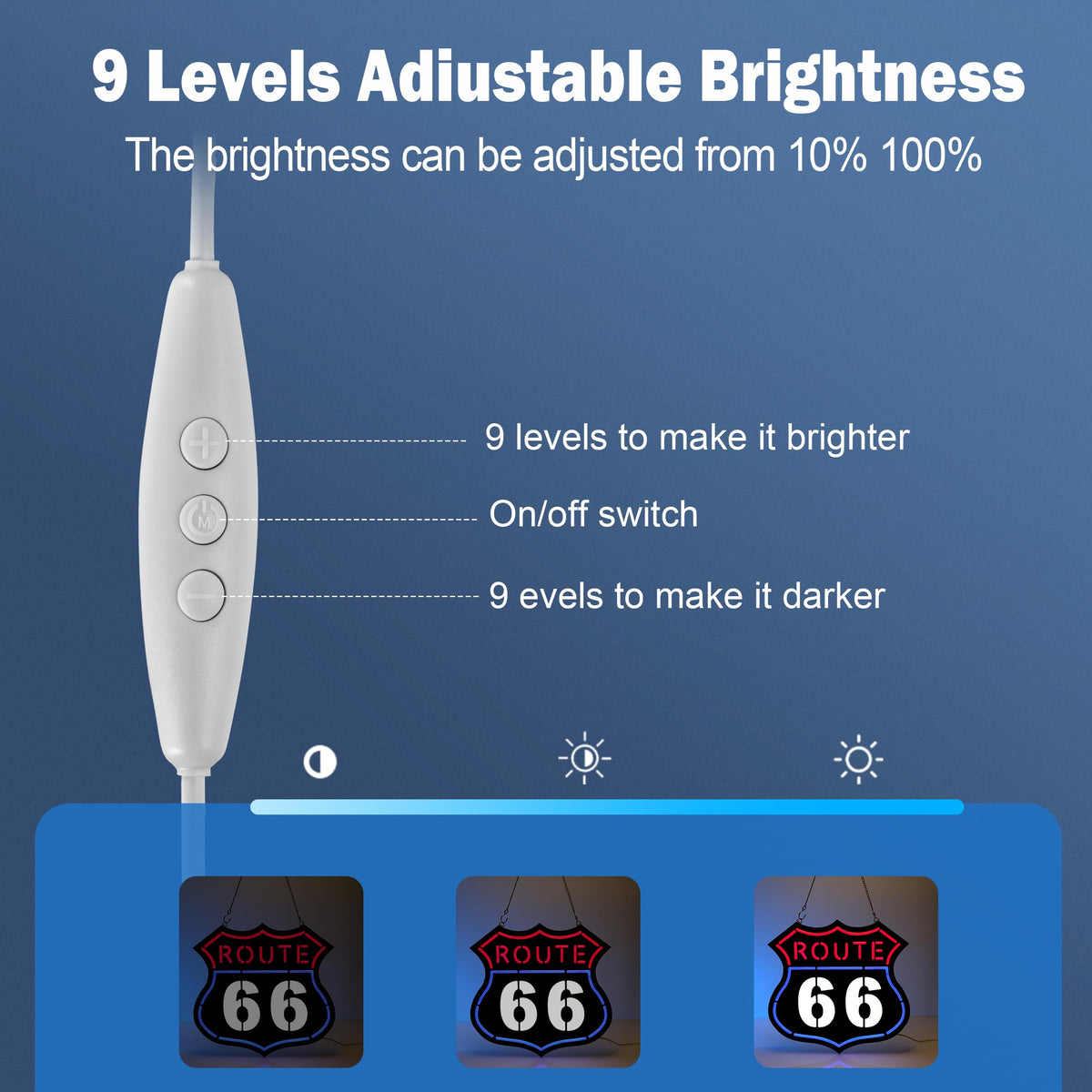 Q: What kind of material is used in the neon sign?A: The Ultrathin Route 66 Neon Sign features an acrylic base plate, a light guide silicone strip, and an aluminum circuit board, ensuring durability and a long lifespan.