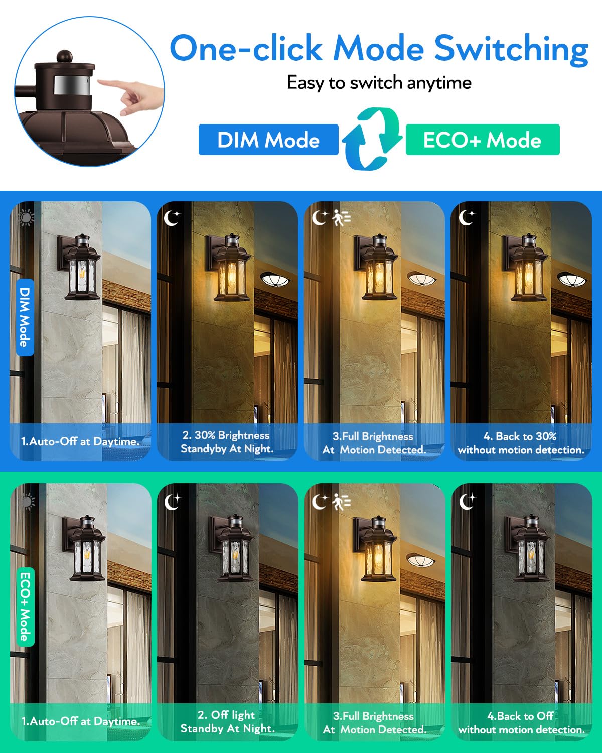 ECO+ Mode: Completely off at night, activating to 100% when motion is detected.