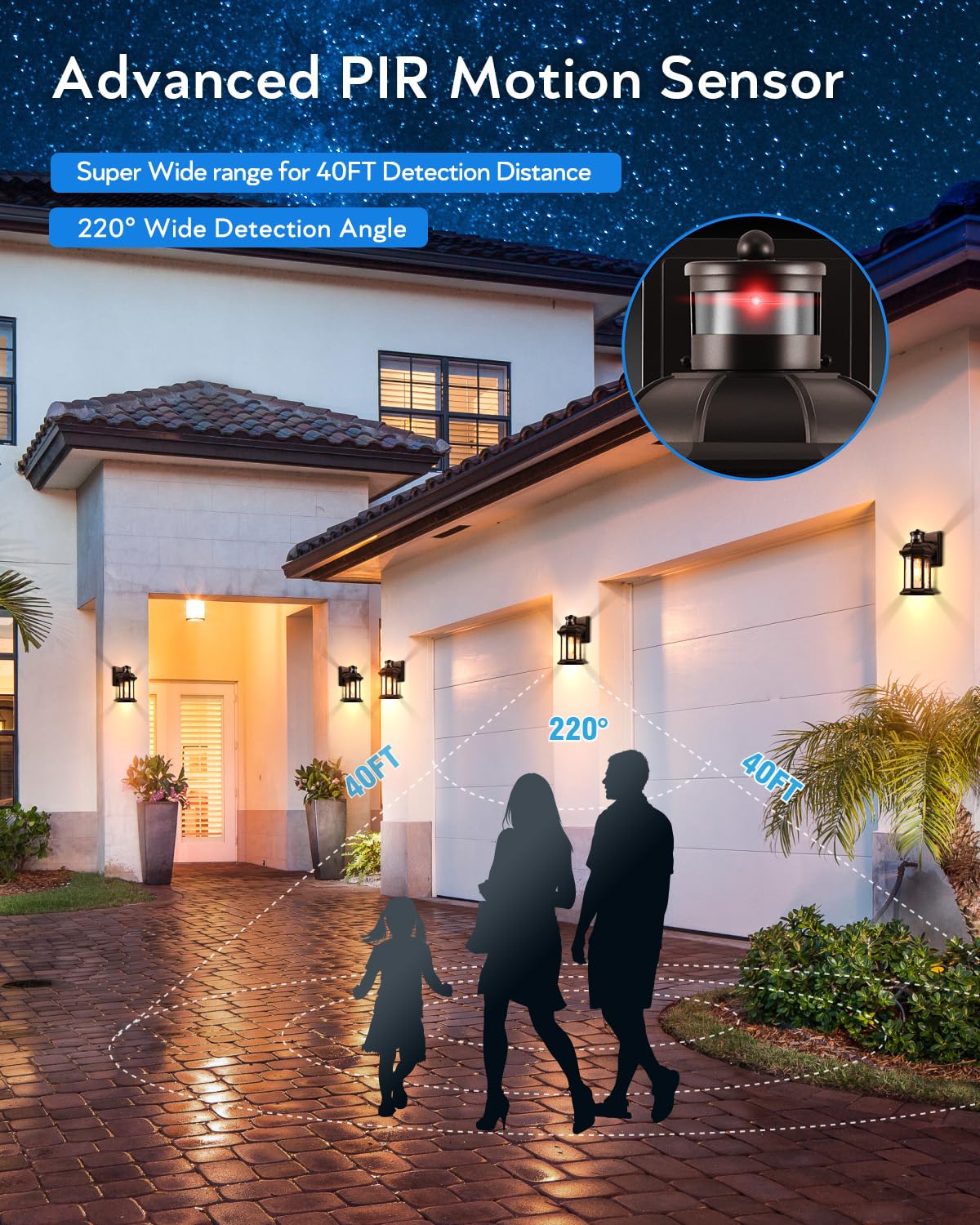 Q: How does the motion sensor work in this outdoor light fixture?A: The motion sensor detects nearby movement and automatically adjusts the brightness. It operates at 30% illumination when there is no motion and shifts to 100% brightness when motion is detected, ensuring safety and energy efficiency.