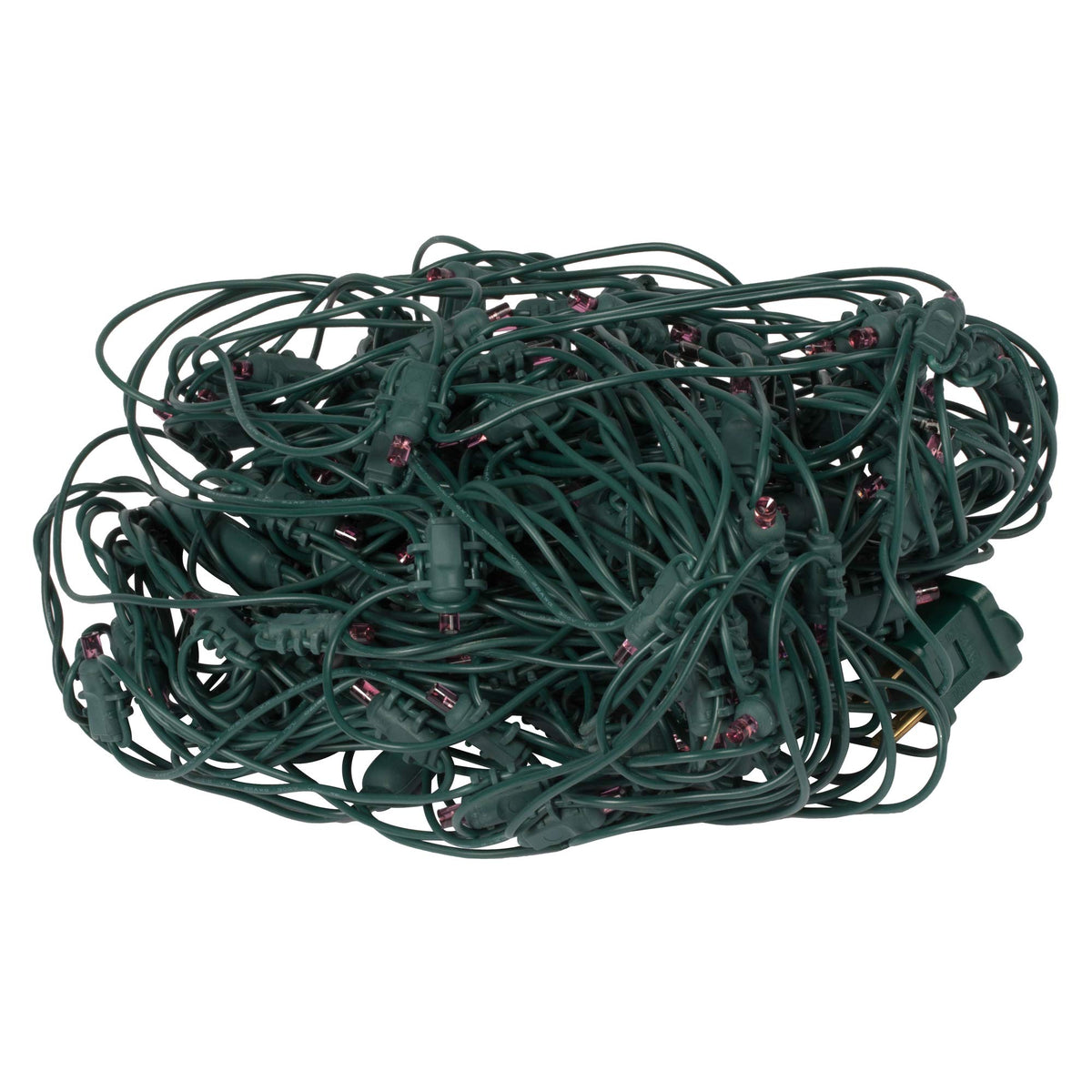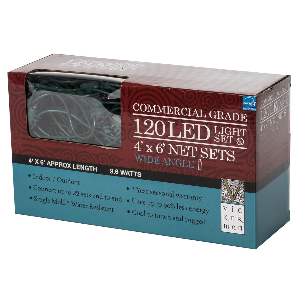 Vickerman 120 Purple Wide Angle LED Christmas Net Twinkle Light Set. Brighten your Holidays with this Net light set featuring 120 Purple Wide Angle LED Single Mold Twinkle lights on Green wire, a 12" lead wire, and an 4" end wire. This Net light set measures 4' high x 6' long, is UL approved, and has the ability to connect up to 17 sets. 9.6 watts.