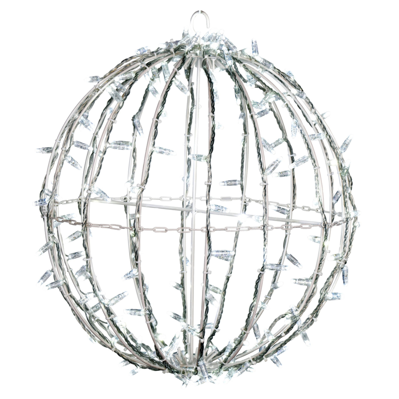Vickerman 180Lt x 20" Fold Flat Cool White Led Jumbo Hanging Sphere with White Powder Coated Frame. UL 24 Volt 3mm LED Lights with 10 Watt Waterproof Outdoor Transformer, AWG22 Transparent Cable and 6' Lead Wire Male Plug.