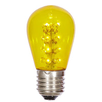 Vickerman S14 Yellow LED Transparent 1.3 Watts, 130V, E26 Medium Nickel Base Bulb, very high value, guaranteed 25000 hrs, inside painted bulbs, 25-26 Lumens., 5 per pack Features: - Utilizes Energy-Effiecent, Durable LED Technology - Lights Type: Christmas Lights - Shape: S14 Transparent LED - Base: E26 Medium Screw - Wattage: 1.3, Voltage: 130 - Color: Yellow - Rated Life: 25,000 hrs - Warranty: 3 Years Limited