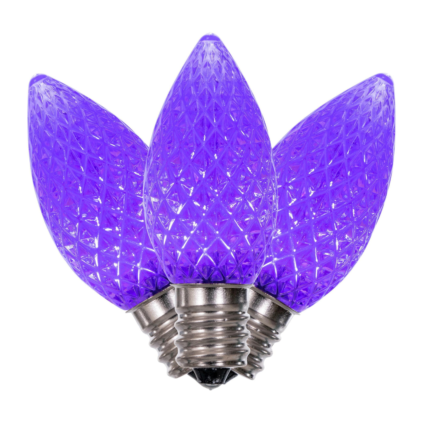 Vickerman C7 LED Purple Faceted Replacement Bulb. Features: E12 Nickel Base, 120 Volt, .38 Watts, Dimmable, 3pc LED, package of 25 bulbs.