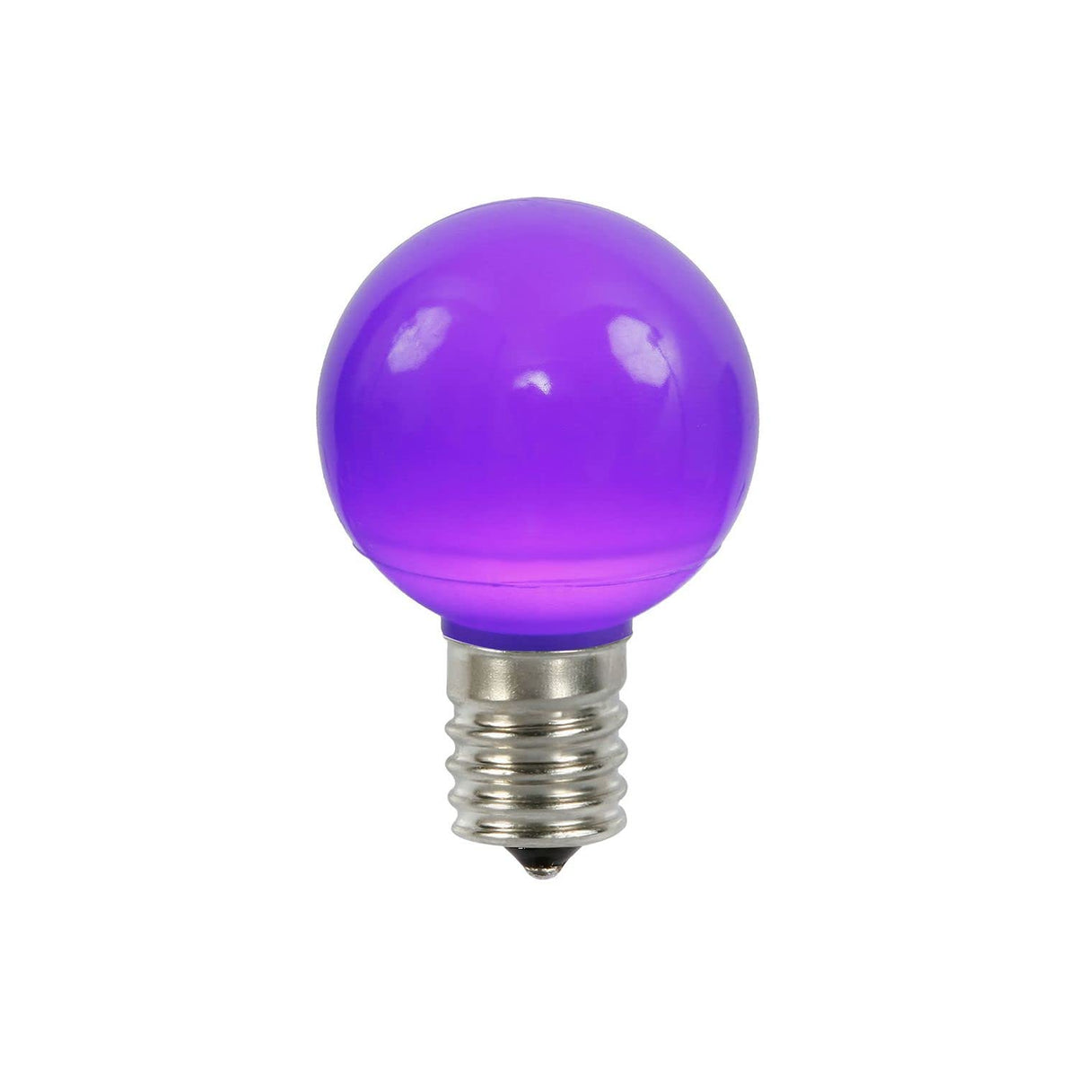 Vickerman G50 Purple Ceramic LED Replacement Bulb. Features: E17 Nickel Base, 120 Volt, .96 Watts, Dimmable. Comes as a package of 25 bulbs.