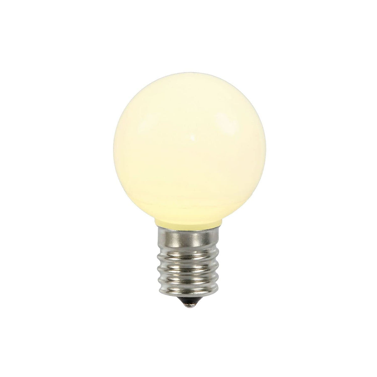 Vickerman G50 Warm White Ceramic LED Replacement Bulb. Features: E17 Nickel Base, 120 Volt, .96 Watts, Dimmable. Comes as a package of 25 bulbs.