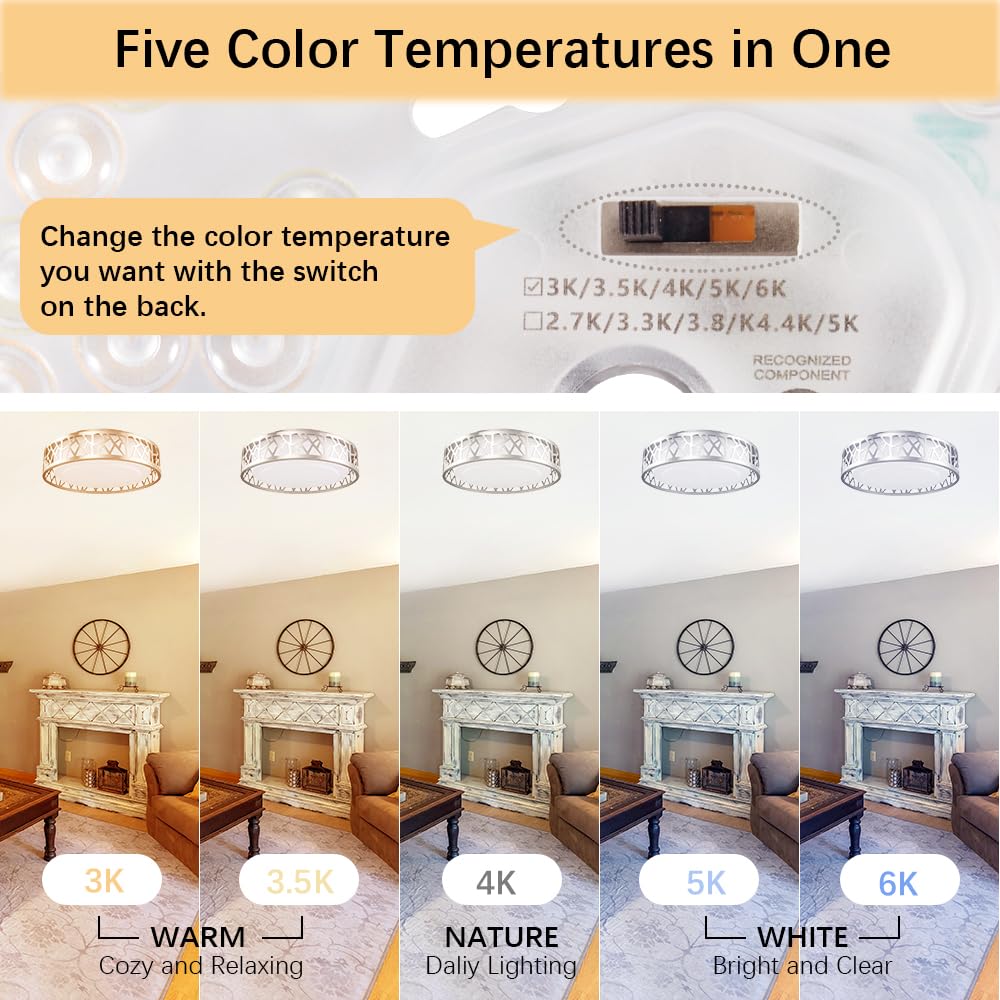 Parameters: Light fixture color: Brushed Nickel Finished Product size: ? 14'' * H4'' Voltage: 120V Power: 24W Light source: 24pcs*1W 2835LED Emitting color: Warm White Color temperature: 3000K/3500K/4000K/5000K/6000K CRI: >80 Luminous Flux: 70LM/W Features: LED source, uses at lease 75% less emergy than incandescent lighting. Dimmable 10% - 100%, compatible with most standard dimmers, buzz free, no humming. 50000 hours lifespan, lasts 10x longer than halogen. 120 volt, 24 watt, 125w replacement uses only 24w. Even light distribution technology. 1400 lumens brightness, 3000k warm white, CRI 80+, 120 wide beam angle. Package list: 1x 24W LED Flush Mount Ceiling Light & Accessories 1x User Manual NOTE: Turn off the main power at the circuit breaker before installing the fixture, in order to prevent possible shock.