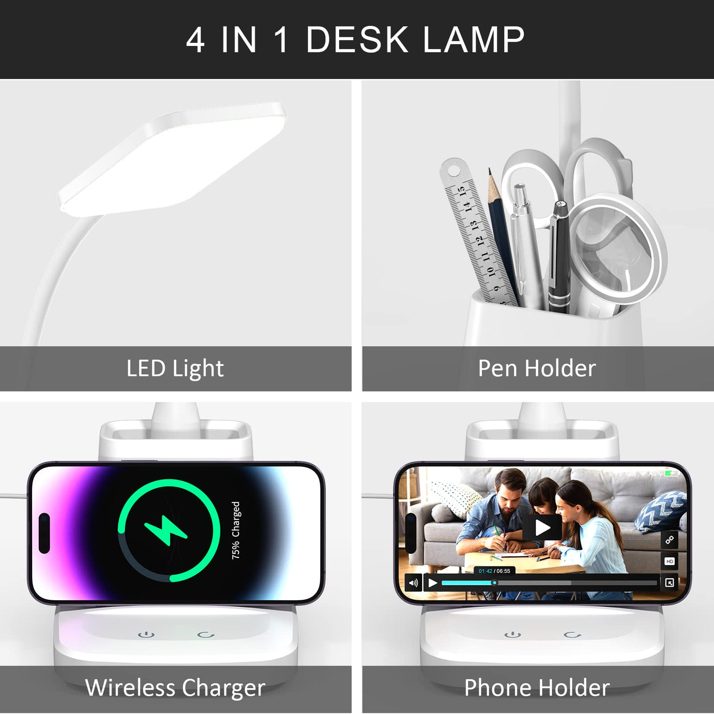 Vicsoon Led Desk Lamp With Wireless Charger For Home Office, Small With Pen Holder, 800Lm,3 Color Modes,Gooseneck, Eye-Caring Wh