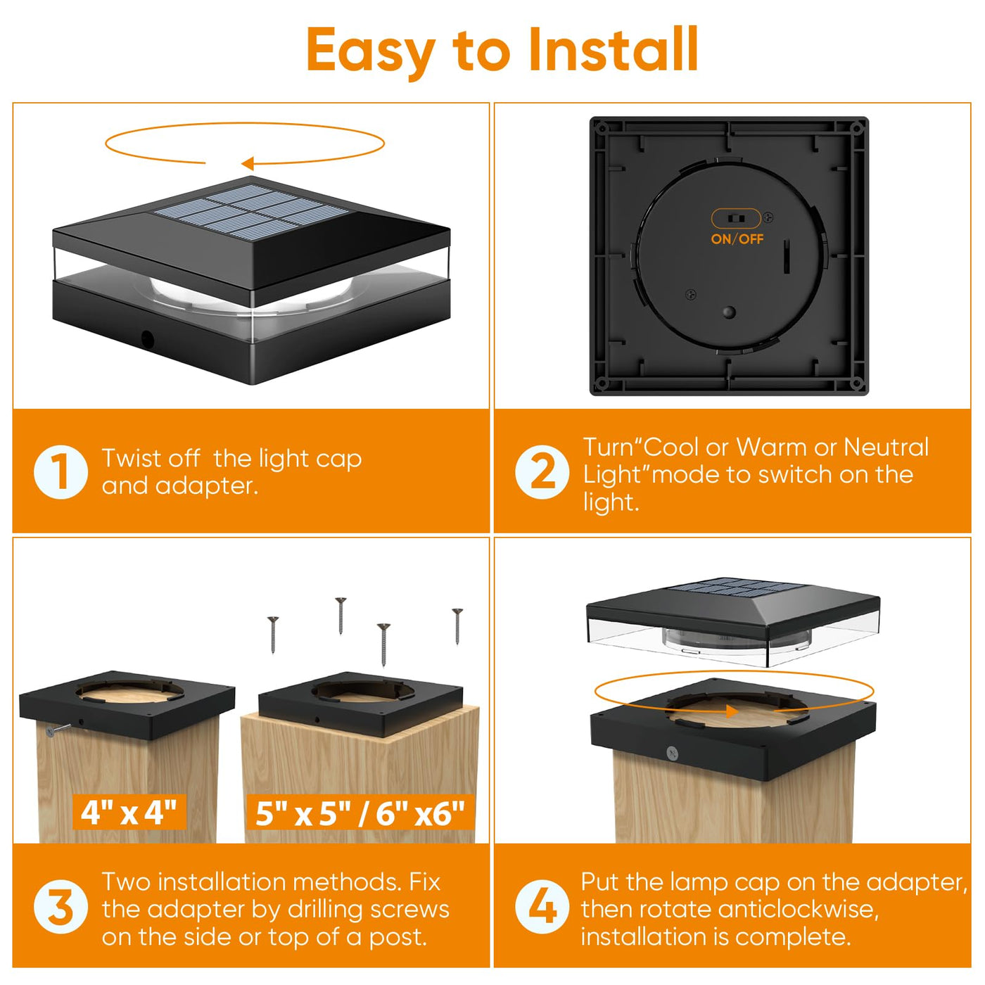 Q: How do I install the Viewsun Solar Post Cap Lights?A: Installation is simple: just screw the solar cap lights into the highest point on your railing or post. Refer to the installation instructions provided in the product images for detailed guidance.