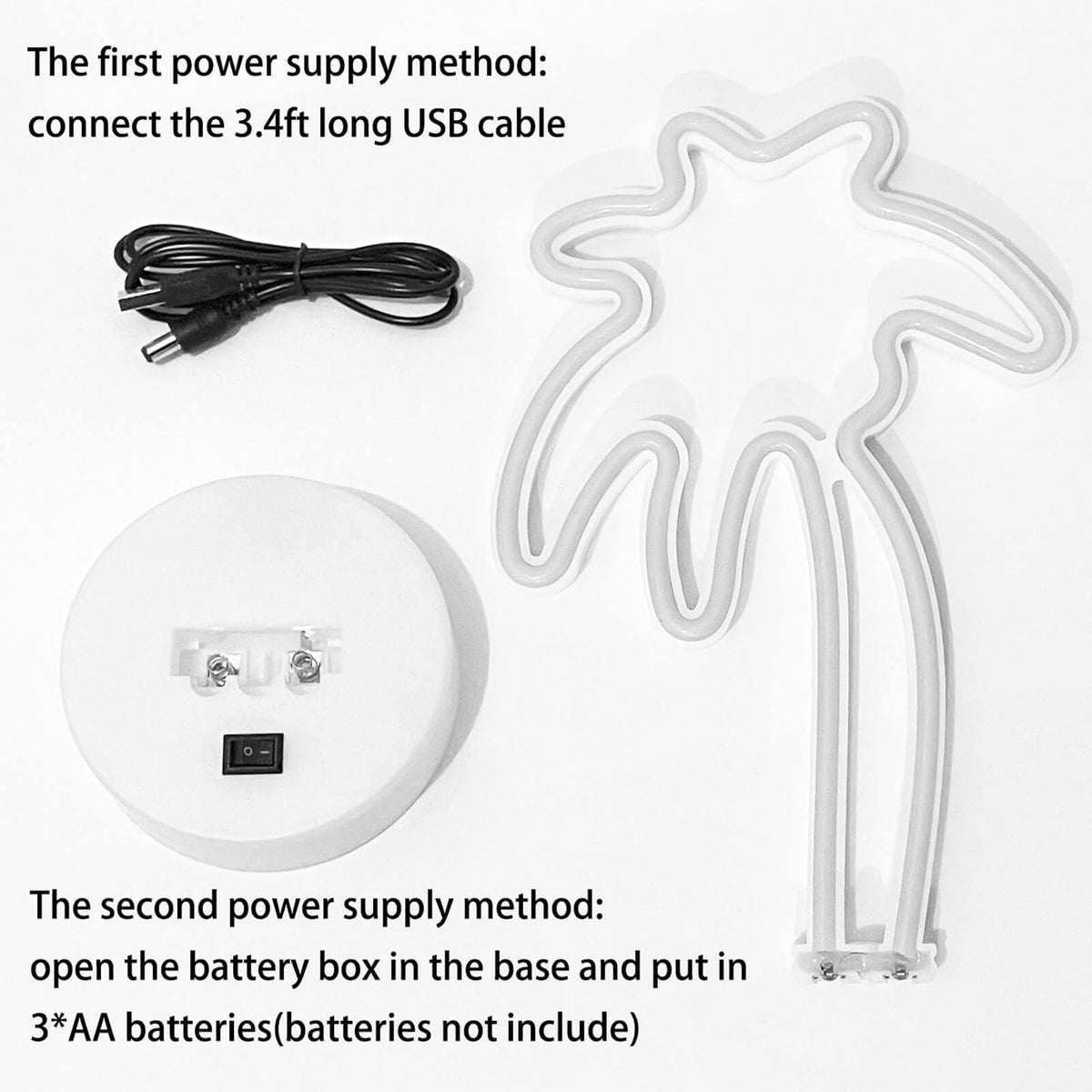 Q: How do I power the palm tree neon sign?A: You can power the VIFULIN Neon Palm Tree Sign using either 3xAA batteries (not included) or via USB. This versatility allows you to place the sign anywhere in your room without worrying about outlet proximity.