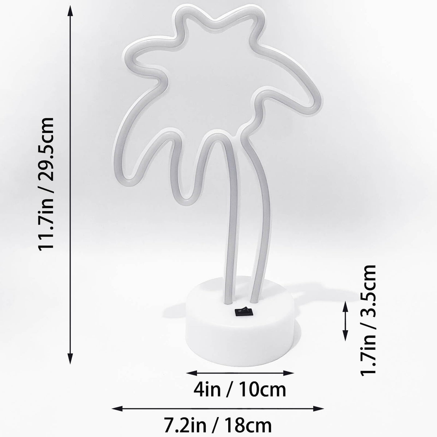 Q: What are the dimensions of the palm tree neon sign?A: The VIFULIN Neon Palm Tree Light measures approximately 4.02 inches in length and 7.1 inches in width, making it a compact and ideal decoration for desks, shelves, or nightstands.