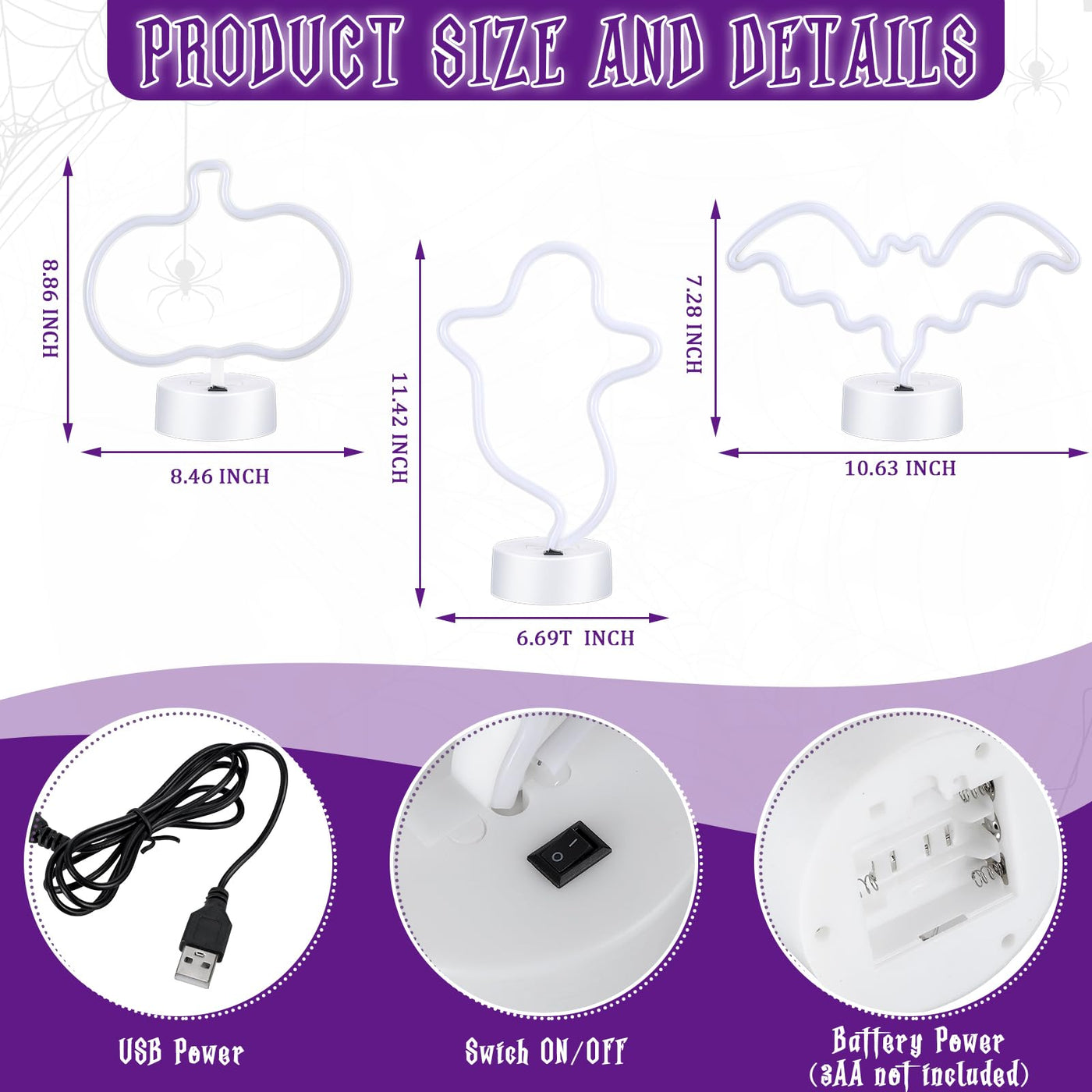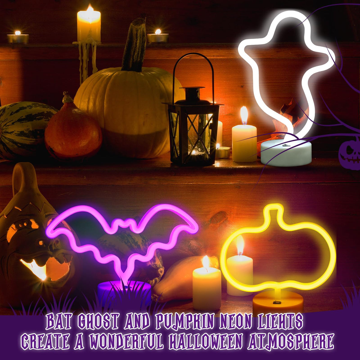 Vihose 3 Pcs Led Neon Halloween Decorations - Ghost, Pumpkin & Bat Night Lights For Home Party