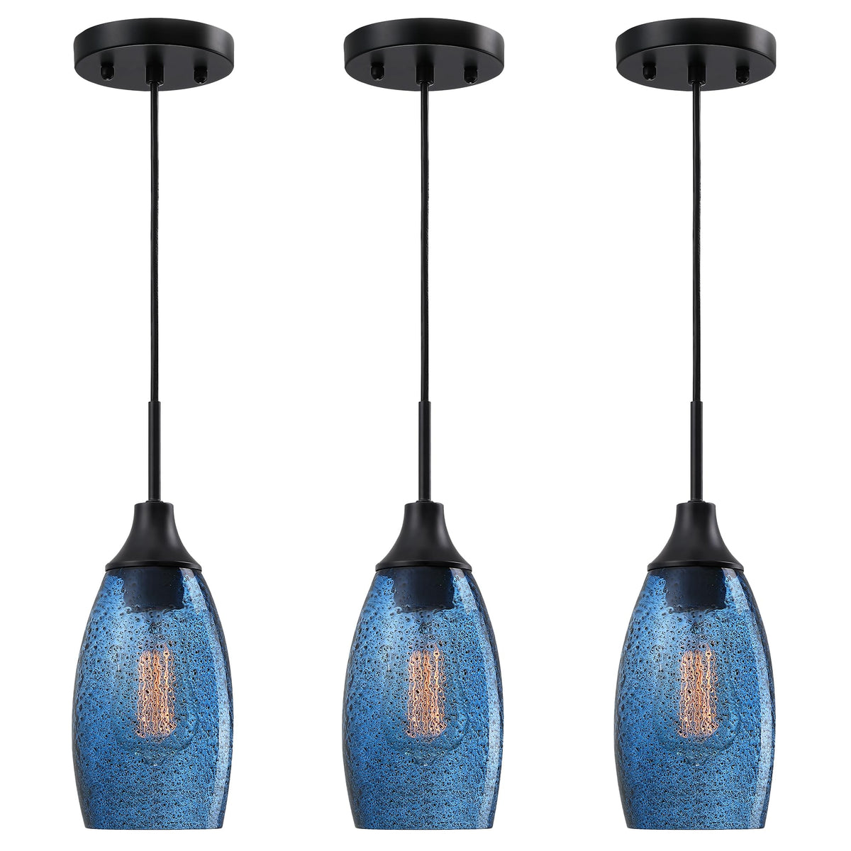 Viinew Mini Glass Pendant Light,4.72'' Dark Blue Glass Hanging Light 3-Pack Handblown Clear Blue Seeded Shade Adjustable Cord Ce