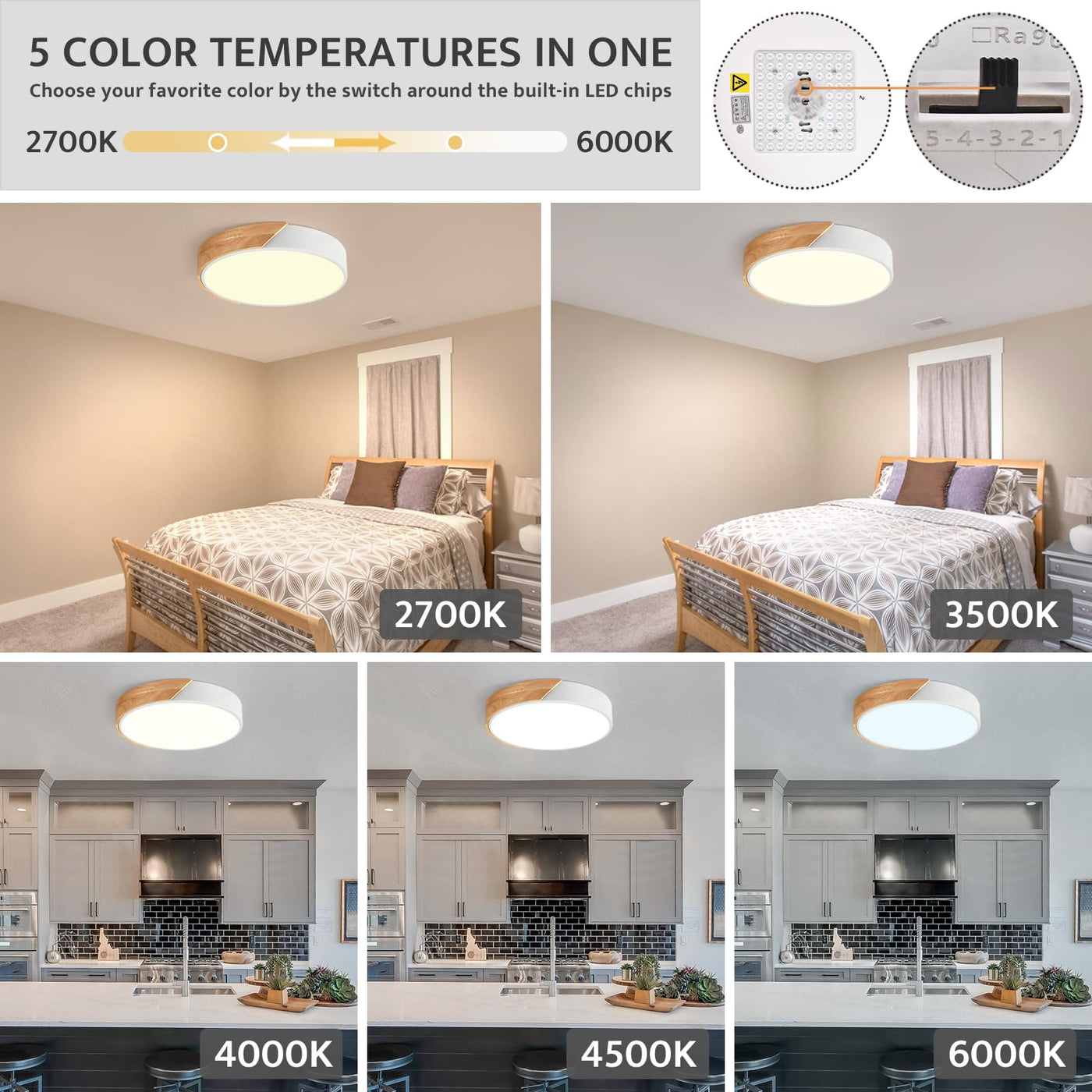 Q: What color temperature options are available with this light?A: The Vikaey ceiling light offers five color temperature options: twenty-seven hundred Kelvin, thirty-five hundred Kelvin, four thousand Kelvin, forty-five hundred Kelvin, and six thousand Kelvin.