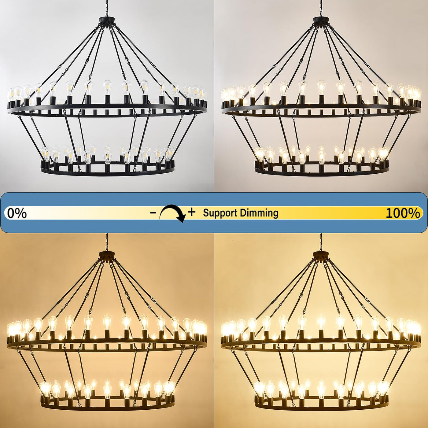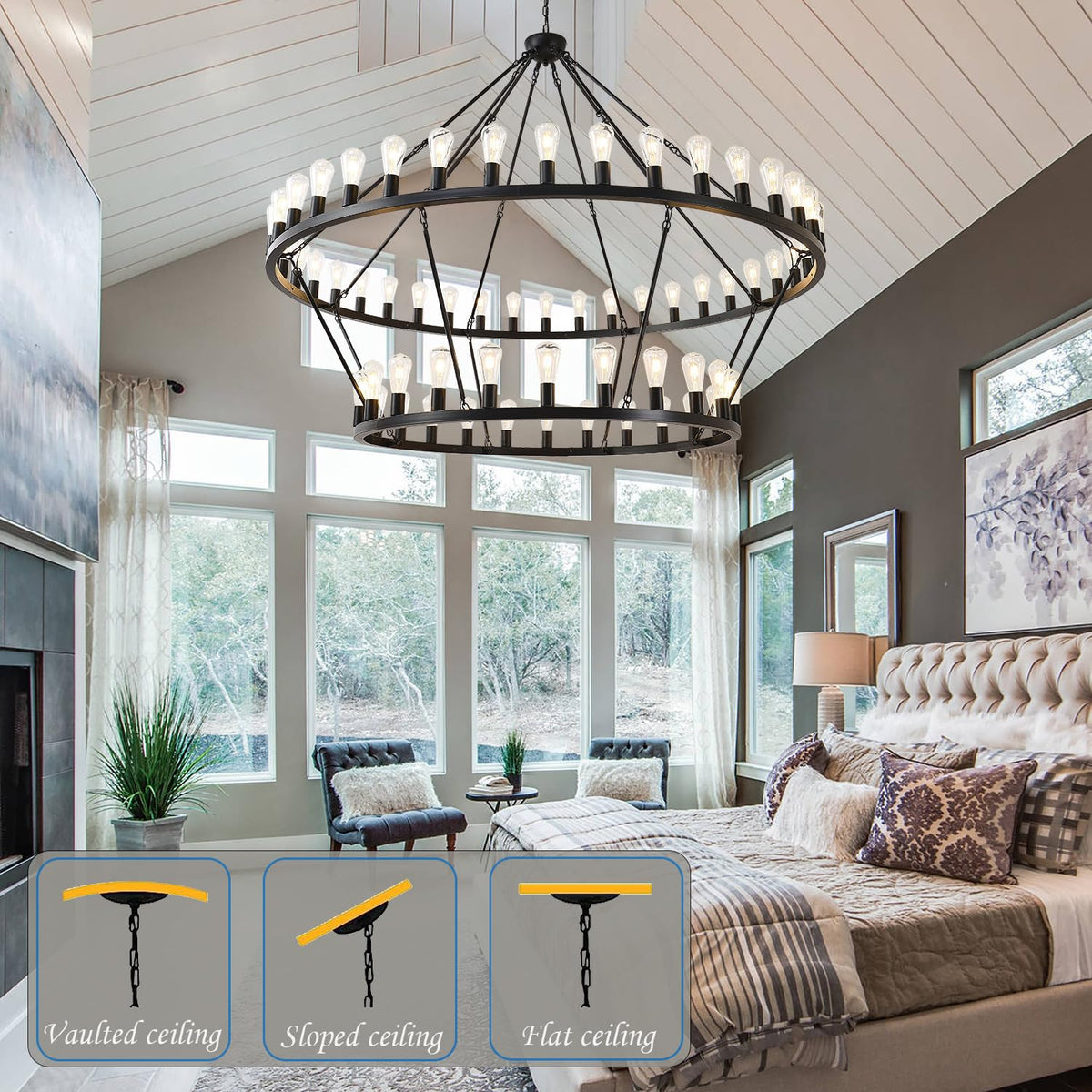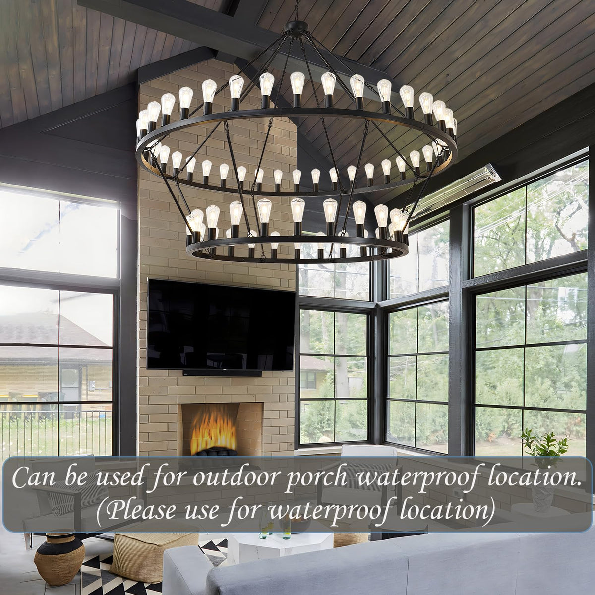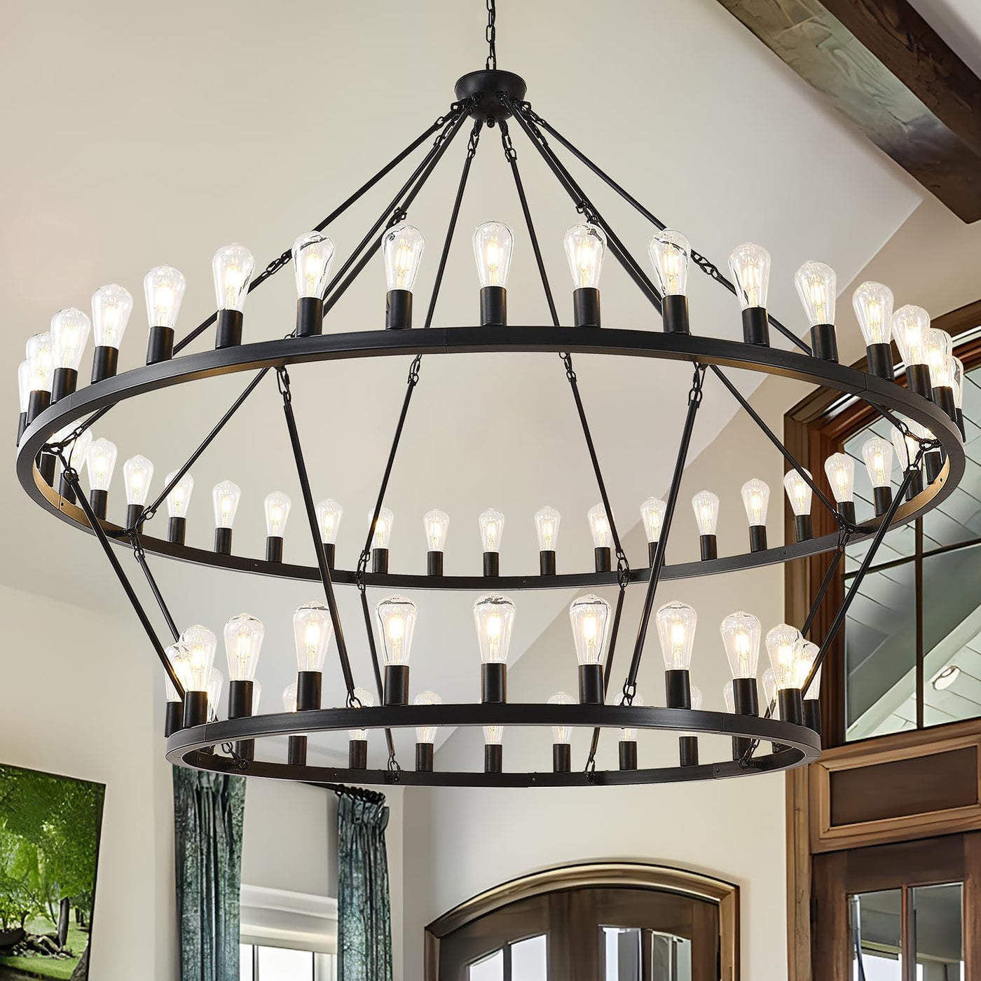 Viksroeo 70 Inch Black Extra Large Wagon Wheel Chandelier, 2 Tier 64-Lights Farmhouse Industrial Round High Ceiling Pendant Light Adjustable Chain, for Dining Room, Living Room