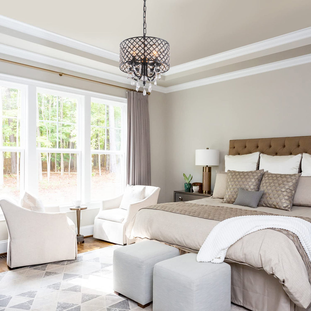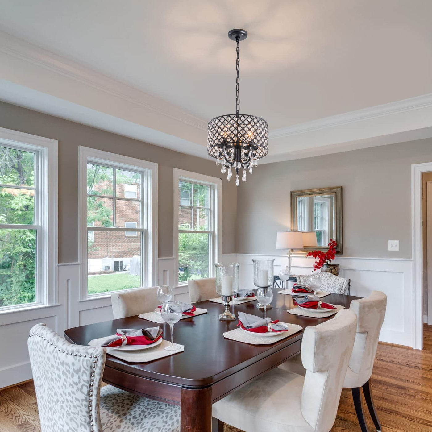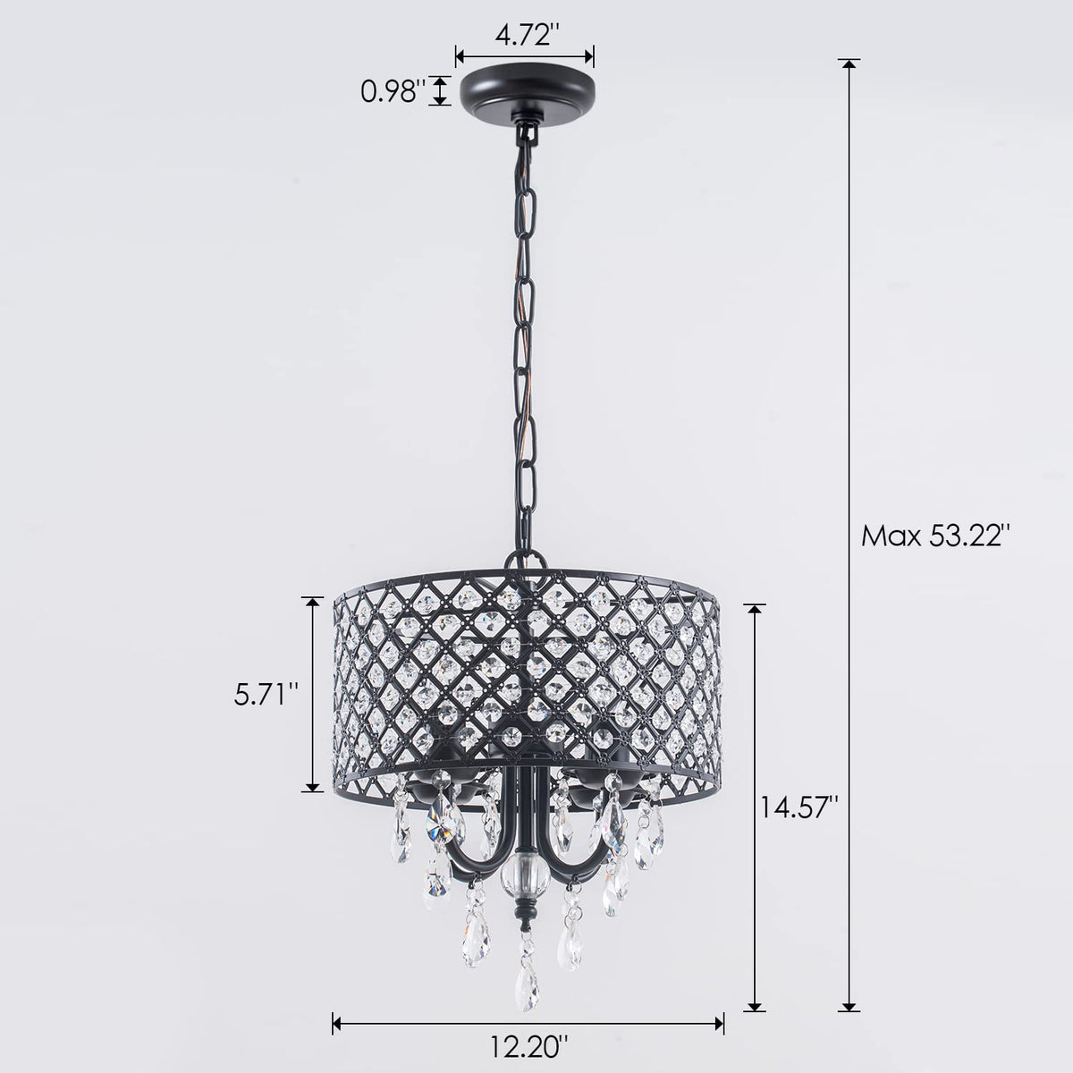 Viluxy Black Crystal Chandelier Modern Ceiling Pendant Light Fixture Drum Raindrop 4-Light Hanging Light For Bedroom Kitchen Isl