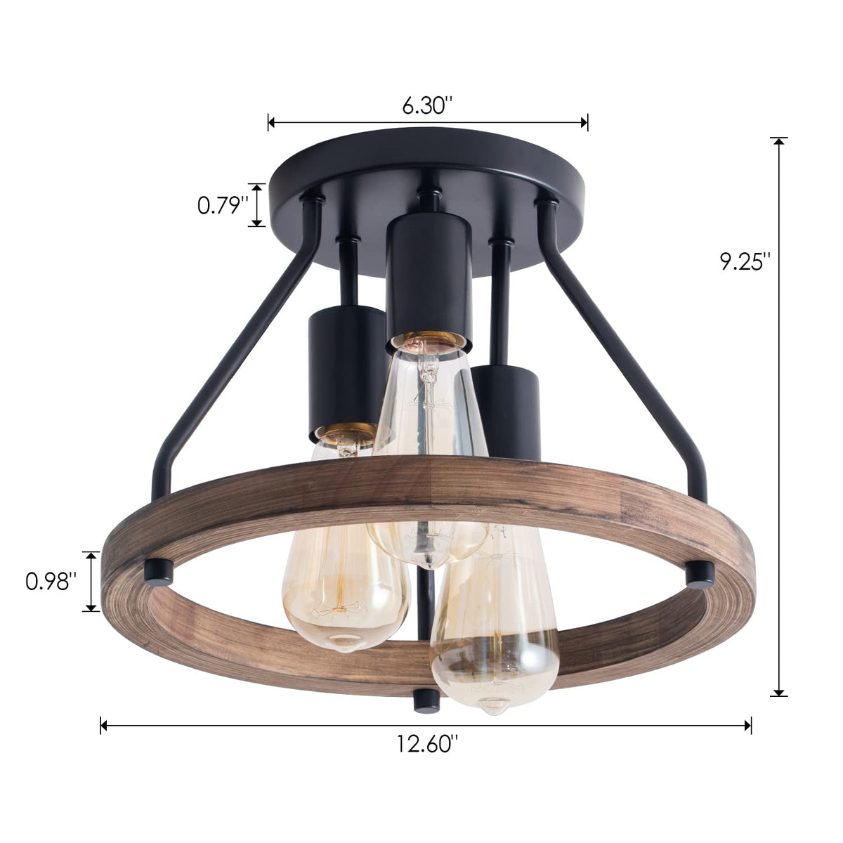 Q: What type of bulbs does the VILUXY Industrial Flush Mount Ceiling Light Fixture require?A: The VILUXY Industrial Flush Mount Ceiling Light Fixture requires three E26 base bulbs, with a maximum wattage of sixty watts each. Bulbs are not included with the fixture.