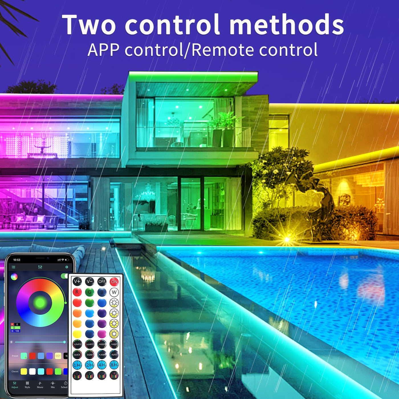 Q: How do I control the color and effects of the LED strip lights?A: The vimeepro LED strip lights can be controlled via an app or a remote control. You can easily change colors, adjust brightness, and sync the lights to music, allowing for a customizable lighting experience that enhances your ambiance.