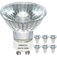 Vinaco focus on gu10 halogen 35w bulbs, professional lighting solution provider, may your life be filled with brightness 2800k warm white light with 380 lumens give off a calm, yellowish glow for a warm, cozy feel, which give your home or office a comfortable atmosphere: Warm and bright 1, Long lasting life: 6-Pack gu10+c 120v 35w, it can switch on and off about 6000 times, saving you the cost of frequent gu10 bulb replacement 2, Anti- Dazzling: Eliminating eyes exhaustion caused by conventional fluorescent light, effectively protecting your eyesight 3, Soft warm white light: Brilliant warm white light, excellent beam control, creates a cosy & relaxing atmosphere 5, Dimmable: Dimmable function can meet any occasion, please only use halogen & incandescent compatible Dimmers 6, Safe to Use: contain no mercury and do not contain any UVIR light, safe for your home and the environment 7, Wide Application: Used for general lighting and Accent lighting, such as kitchen, bedroom, sitting room, shop window, Art galleries, Museums etc Product Specifications Voltage: 110V 120V 130V Watts: 35WBase Type: gU10 Twist-N-Lock base color: 2800K (Warm White) Brightness: 380lm Beam angle: 38 degree Bulb size: 185x20inch Package : Pack of 6 gu10 halogen light bulb