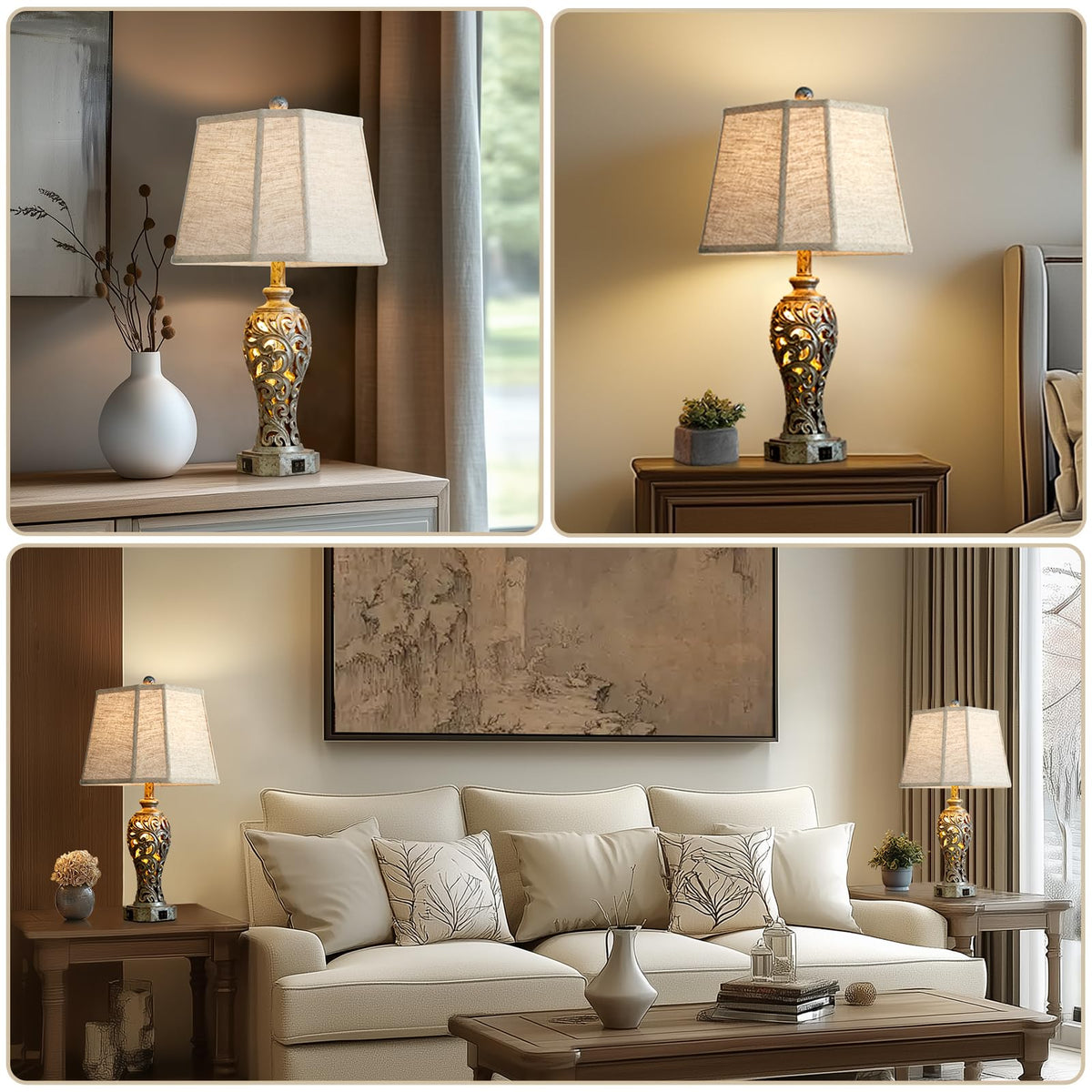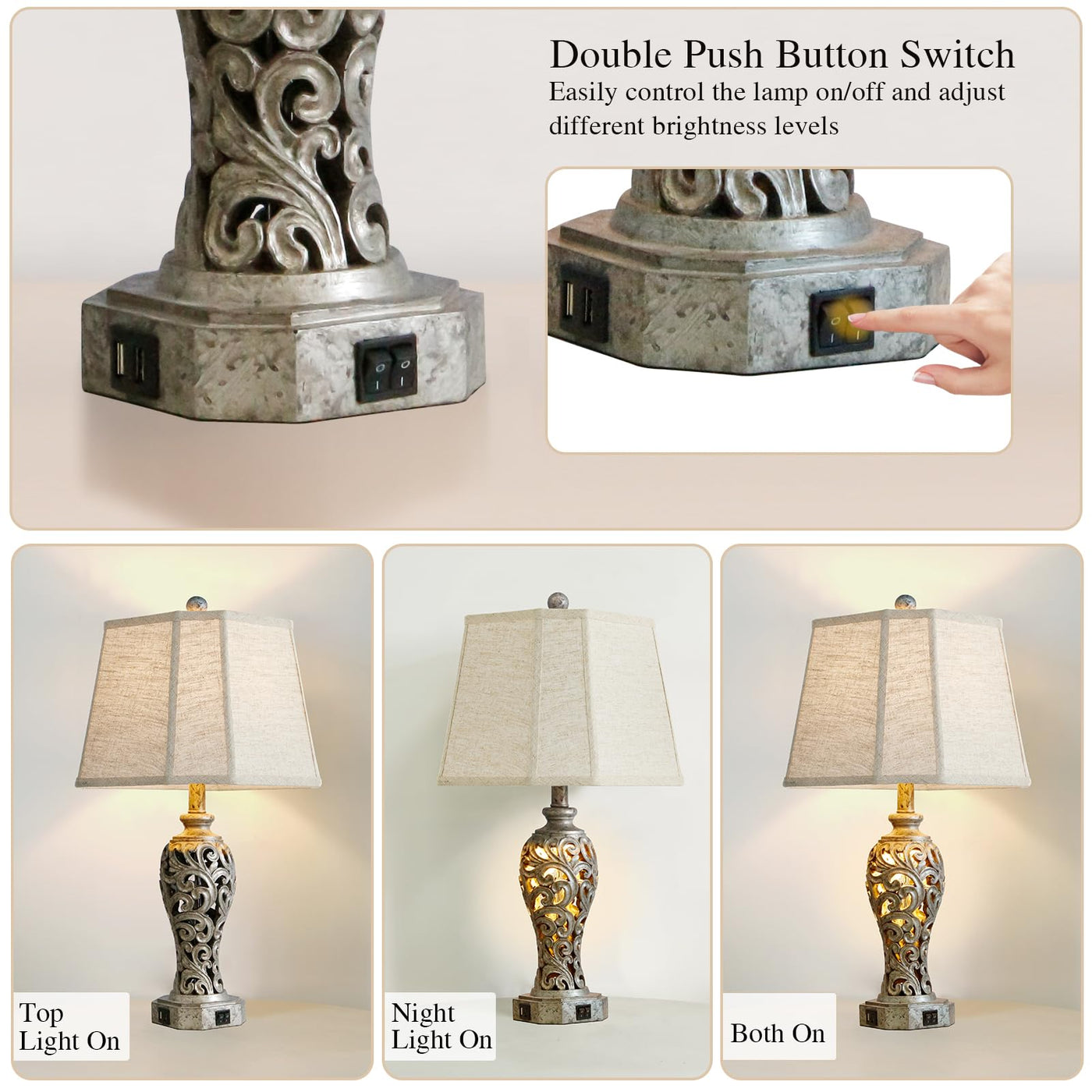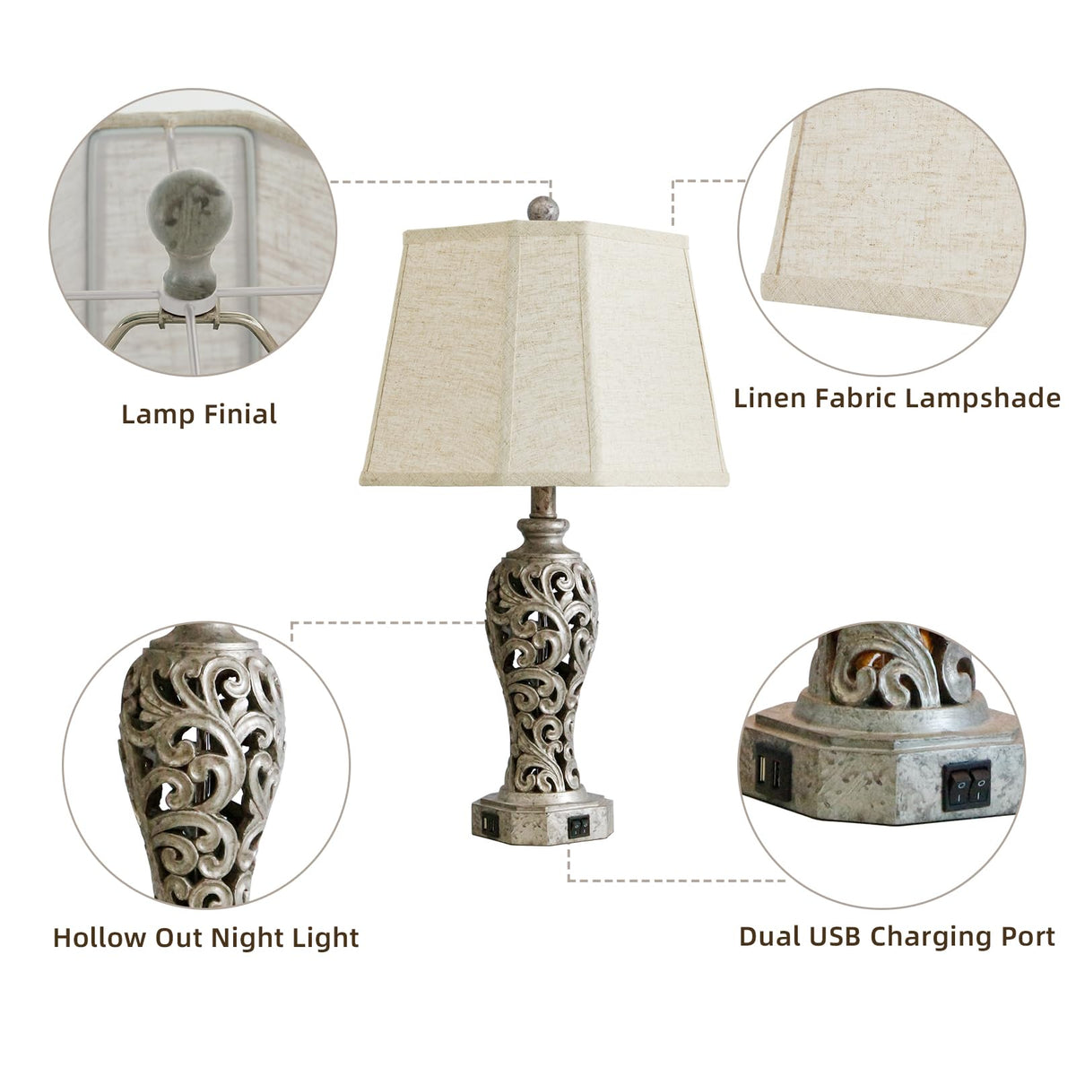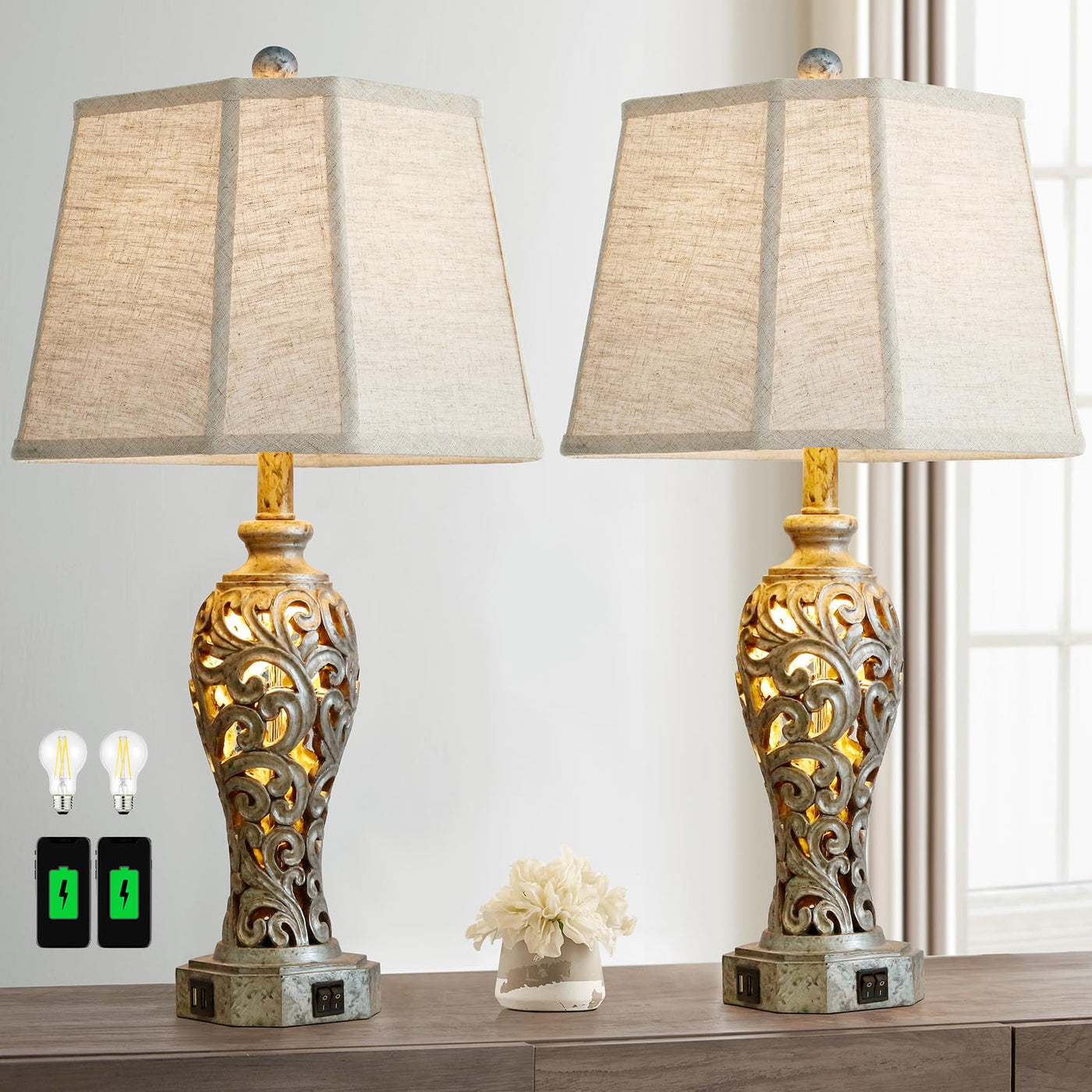 Unique And Exquisite Design, Perfect Home Decor This Bedroom Table Lamp Is Made Of Antique Iron Gray Resin, The Delicate Hollow-Out Lamp Body Blends Perfectly With The Square Corner-Out Linen Shade, Presenting A Modern And Luxurious Look,Which Can Create A Romantic And Cozy Atmosphere For Any Corner Of Your Home. Suitable For Farmhouse, Rustic, Vintage, Retro, Modern, Traditional And Other Home Styles. Multiple Advanced Function Dual Usb Charging Ports Allow You To Easily Charge Multiple Devices While You Sleep Or Work, The Charging Ports Work Whether The Nightstand Lamp Is On Or Off. The Linen Fabric Shade And Night Light Emit A Warm And Soft Light That Easily Creates A Romantic And Charming Atmosphere. Premium Material & Stable Construction Our Table Lamp Bases Are Made Of High Quality Resin For Durability. The Base Is Equipped With Advanced Non-Slip Pads, The Lamp Set Is Super Stable And Safe To Use. Simple Installation All Accessories Are Included In The Package For Quick Installation. Follow The Manual, And You Will Get A Stunning Table Lamp Set In A Few Seconds, Which Saves Much Time And Effort. Specification: Supportive Wattage: 60W Max Power Source: Corded-Electric Material: Resin+Fabric Usb Charging Port: 2 Switch Style: Push Button Switch Package Included: 2 X Lampshades 2 X Lamp Bases 4 X Led Bulbs 1 X User Manual A Large And Tall Table Lamp, Perfect Decoration For Your Living Room And Bedroom.