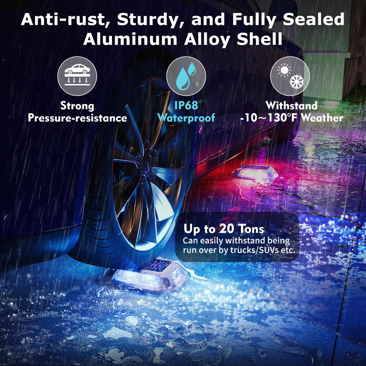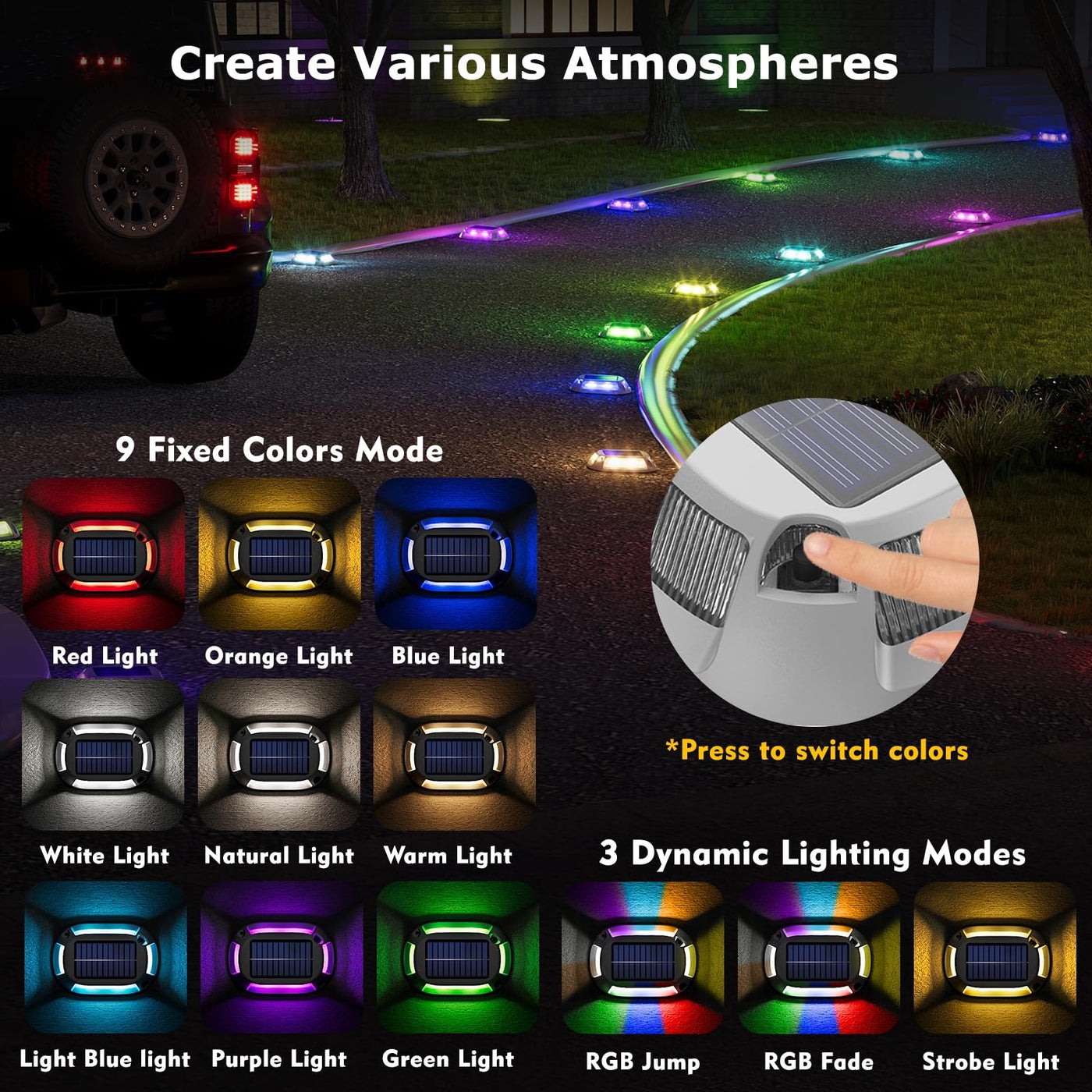 1. They are sturdy aluminum alloy solar deck lights that auto light up from dusk to dawn, with 9 fixed light colors and 3 dynamic light effects (RGB and warning light). 2. These solar deck lights for outside have good waterproof and load-bearing performance. They are never afraid of snowy or rainy days, and they will not be damaged by car or truck tires running over them. 3. They have two installation methods, one is to fix them on hard floors such as decks, concrete floors, tiles, roads, etc. with screws. The other is to fix them on soft floors such as grass, dirt, sand, etc. with ground stakes. Insert these outdoor solar lights into outdoor driveways, gardens, pathways, steps, etc., and they will become beautiful and practical outdoor lighting decorations.