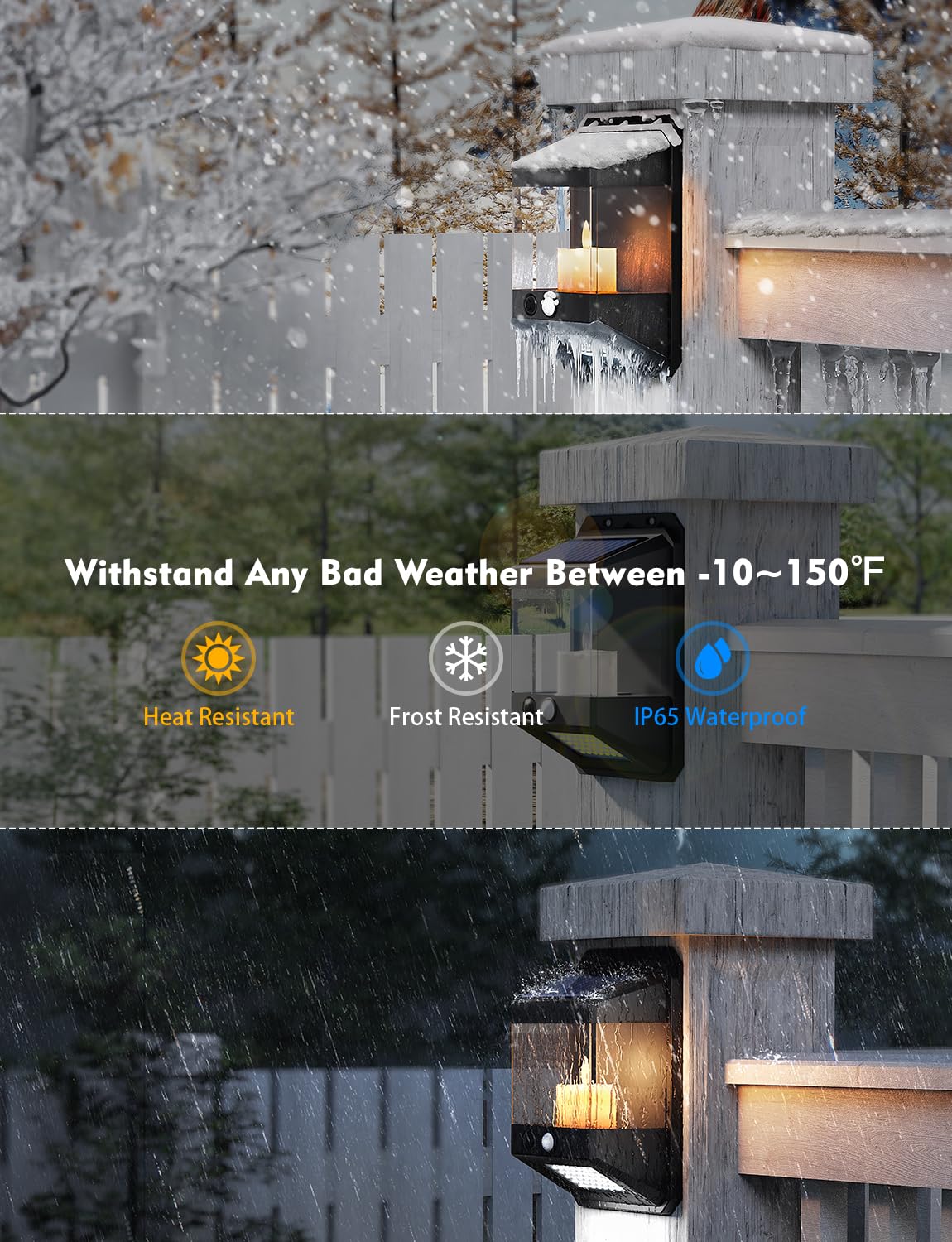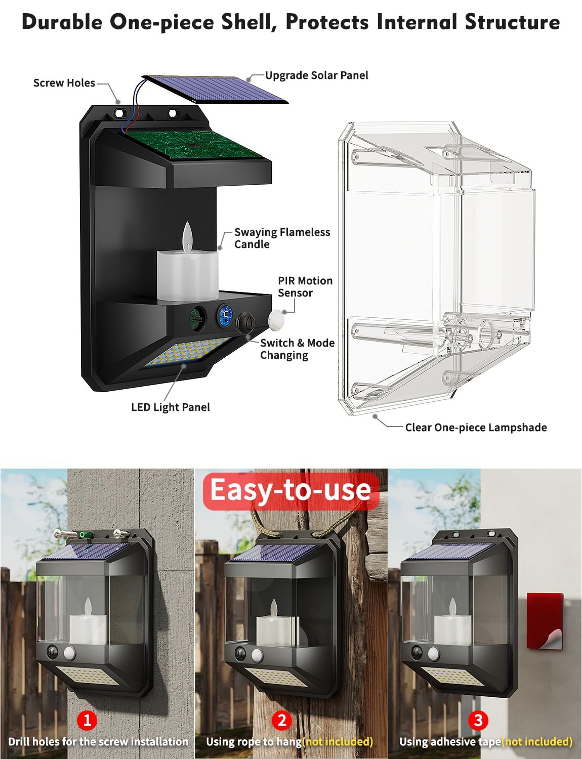 1. This is an solar powered outdoor wall lights with a patented design. It has a built-in permanently swaying flameless candle light and a bright LED light panel activated by motion detection, making it an outdoor solar light fixture that is both decorative and practical. 2. It has two lighting modes. The candlelight above is soft and warm, and can continuously illuminate from dusk to dawn, playing a beautiful decorative role; the LED light panel below is bright and clear, and will light up once any movement is detected at night, can be used as outdoor lighting and safety reminder. 3. The one-piece transparent shell design allows it to have a wide viewing angle of the vivid candle light, while well protecting the internal structure from all kinds of bad weather. It is IP65 waterproof, heat-resistant, and freeze-proof. Suitable for use in temperatures 0~150°F. 4. The upgraded high-efficiency solar panel is more than 51% more efficient than ordinary solar panels. It only takes 4 hours of sunlight to ensure lighting needs for a whole night. It is easy-to-install and requires no external power supply. Suitable for various outdoor scenes, such as walls/courtyards/decks/porches/fences/patios, etc.