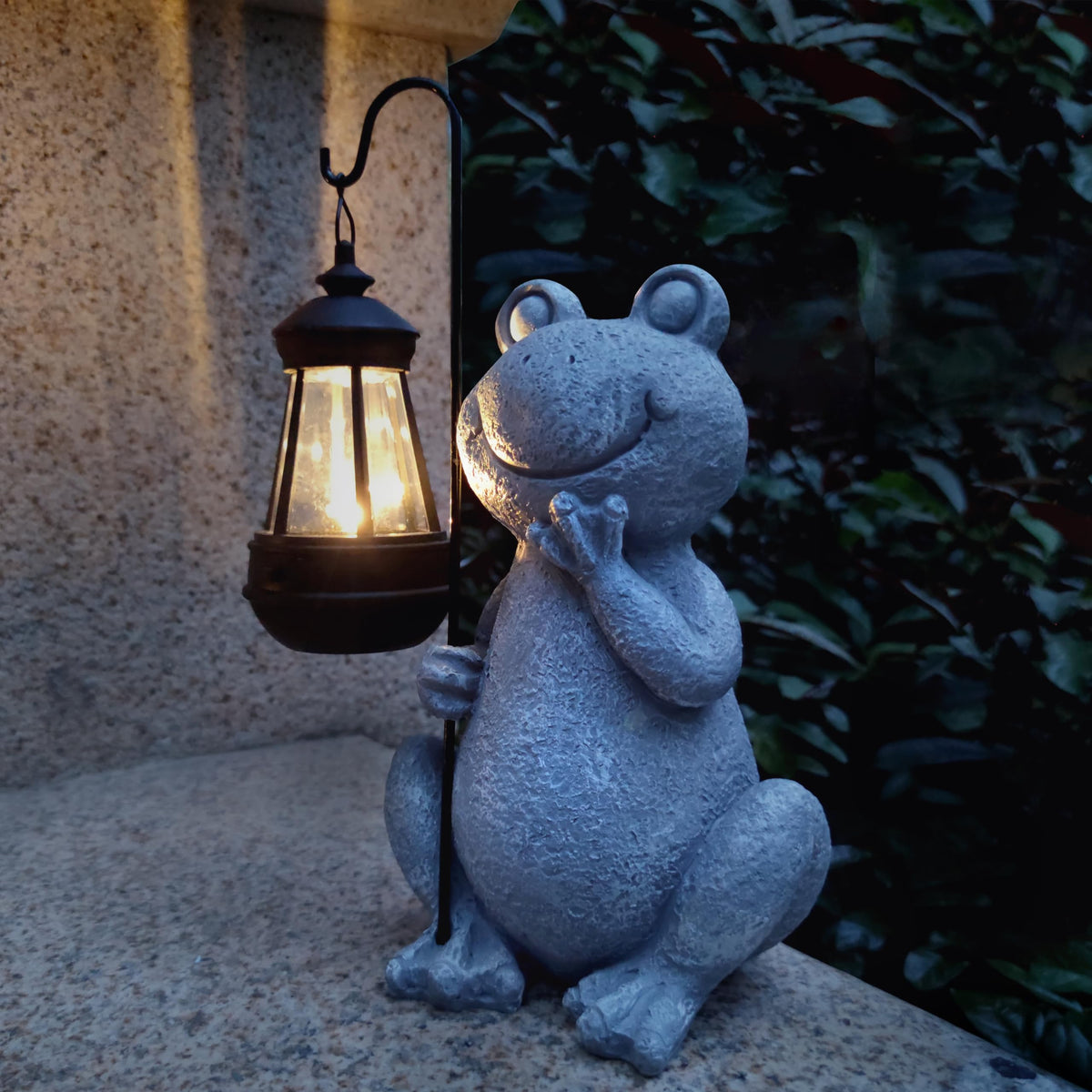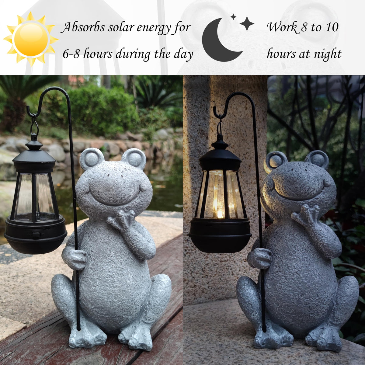 Q: How does the solar charging feature work on this frog garden statue?A: The solar panel charges during the day and automatically lights up at night. Once the switch is pressed, ensure the solar panel receives direct sunlight to fully charge, typically within 6-8 hours.