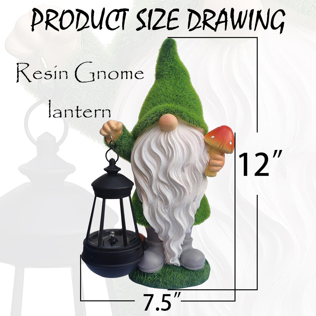 Q: How does the solar light work in the gnome statue?A: The solar light inside the lantern is powered by solar energy. The solar panel converts sunlight into energy, which is stored in a battery, allowing the LED light to illuminate at night.